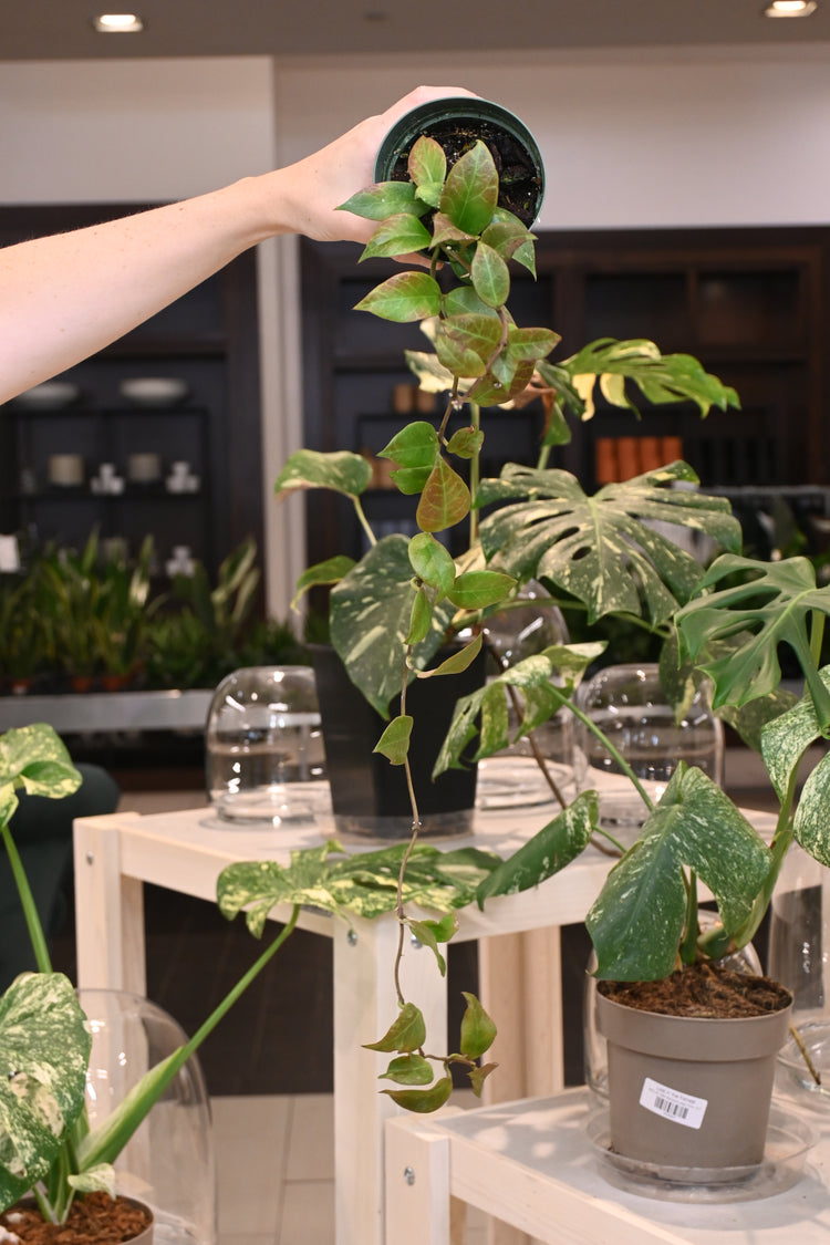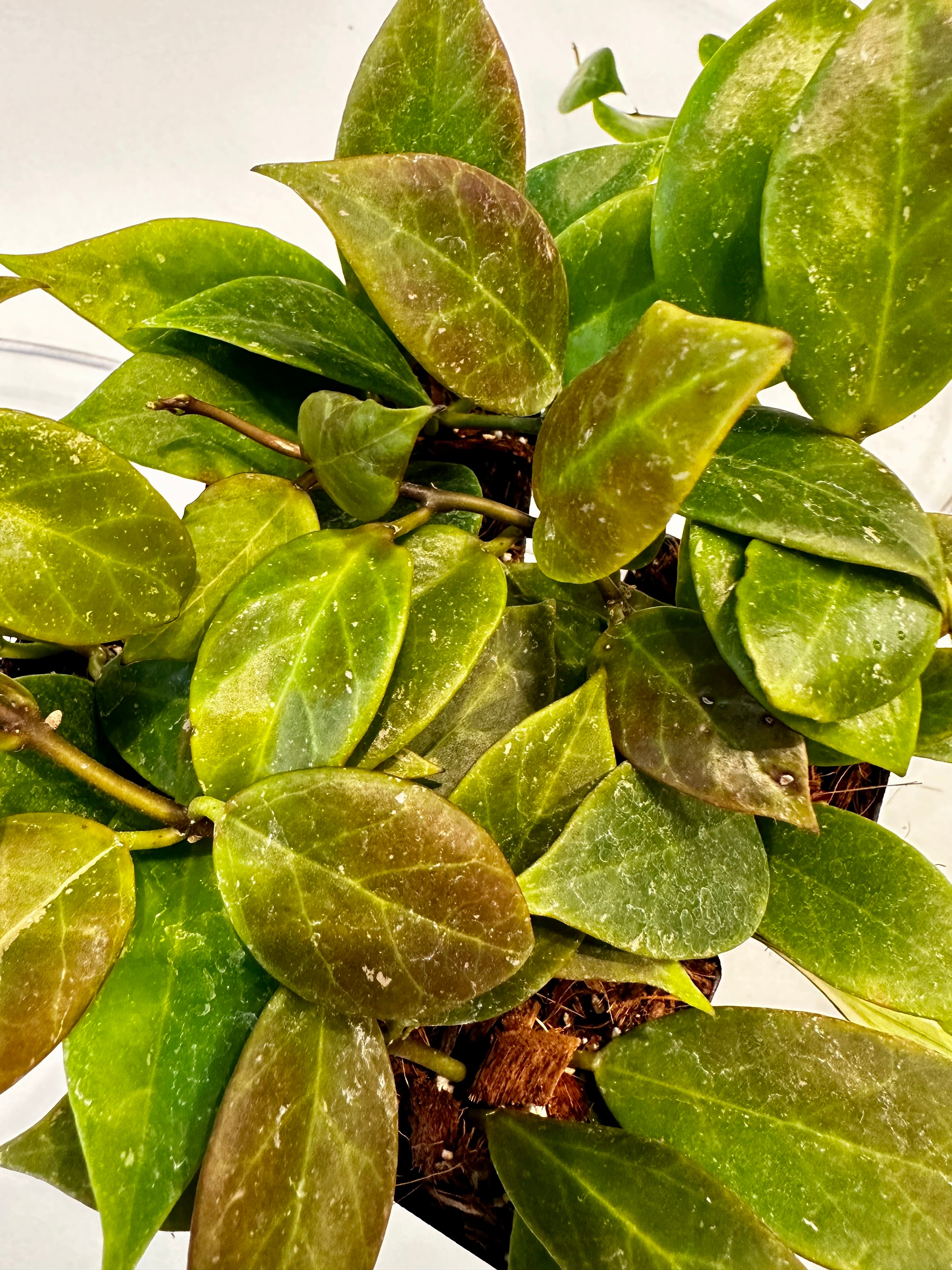 Hoyas also seem to come in every shape, size, color, and texture. One of our most beloved Hoya characteristics is sun stress! While a Hoya Sunrise has a simple shaped green leaf that is often overlooked by plant parents, give them more light and they transform into a new plant. Their green leaves take on a new reddish color. Give them even more light and the color becomes more intense. This underrated Hoya will not dissapoint, especially for pet loving plant parents, as it is also pet friendly.