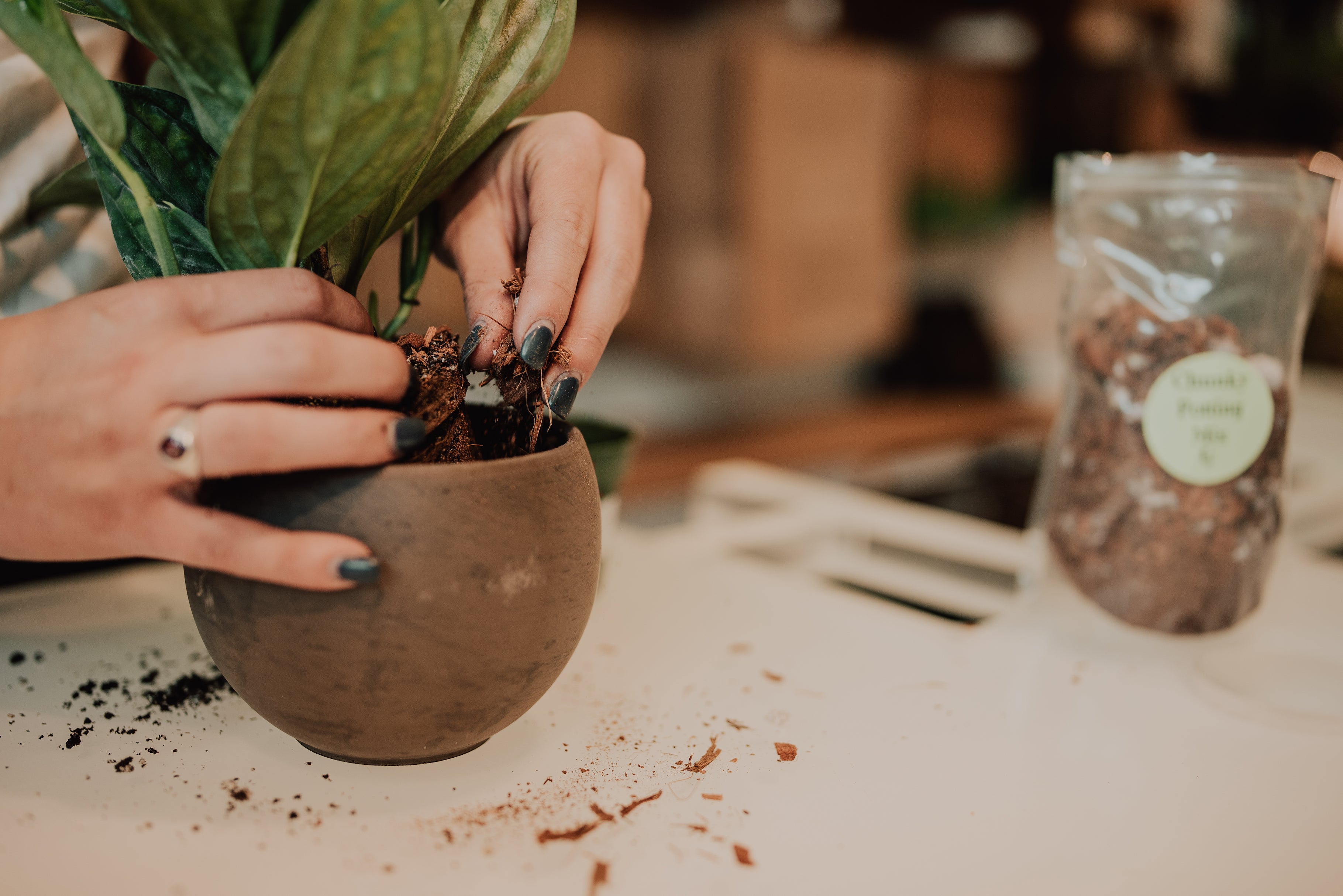 Chunky Soil + a Drainage Hole is the most-ideal setup. A balance of water retention and aeration is key in the potting pix. We use a mix of coco-coir, perlite, & coco-chips. It is our go-to for finding the perfect balance. Check out our Heather Collection of pots, these adorable pots have drainage holes and a matching saucer too!