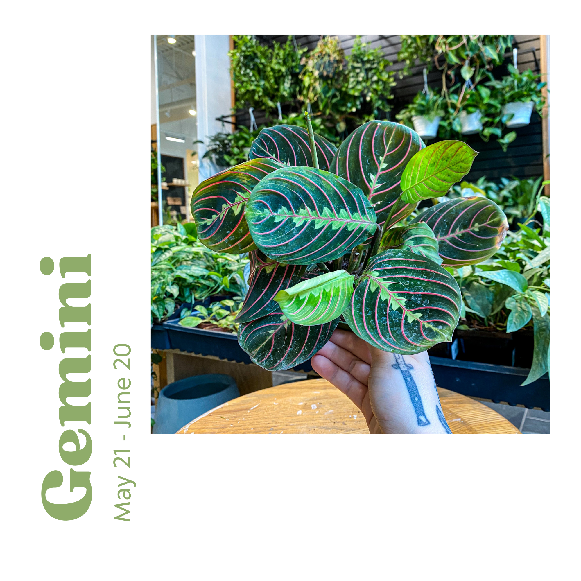 Gemini is an Air sign, they are expressive, clever, and mostly extroverted! The Red Marantahas expressive foliage that follows the light source with beautiful patterns and color. These fast growers are a great plant for any plant parent. Bonus, they even get along with your pets!