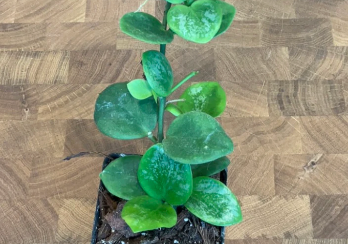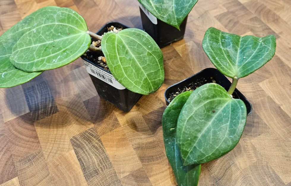 Shop Hoya Sarawak- Leaves are heart-shaped, more rounded, and slightly smaller than Marginata's. They feature distinct veining and a glossy, vibrant green hue.