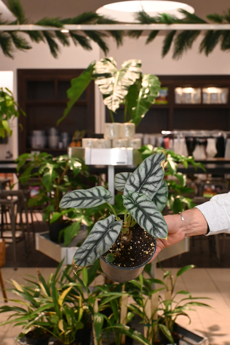 Alocasia plants are humidity lovers & heavy feeders. They prefer bright, filtered light and for their soil to be consistently moist. Water when the soil is dry about 2” down from the top of the pot. Keep your alocasia in a chunky potting mix.