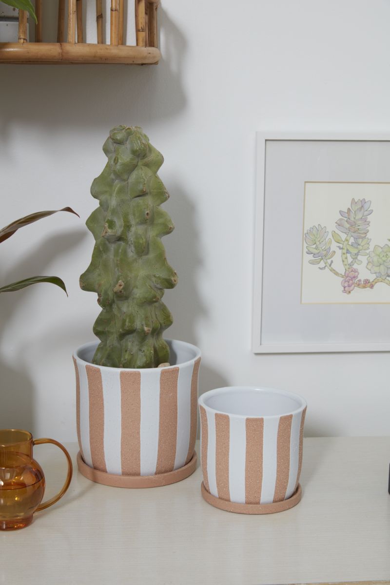 A bit of natural color goes a long way with the warm, unfinished terracotta & white glazed pattern of the small, curved Andreas Pot. Featuring surface texture on the terracotta stripes & saucer, this unique piece offers appealing hues that complement any decor, whether in a den, kitchen, or bedroom. Add a drop-in plant, & the drainage hole allows for easy watering.
