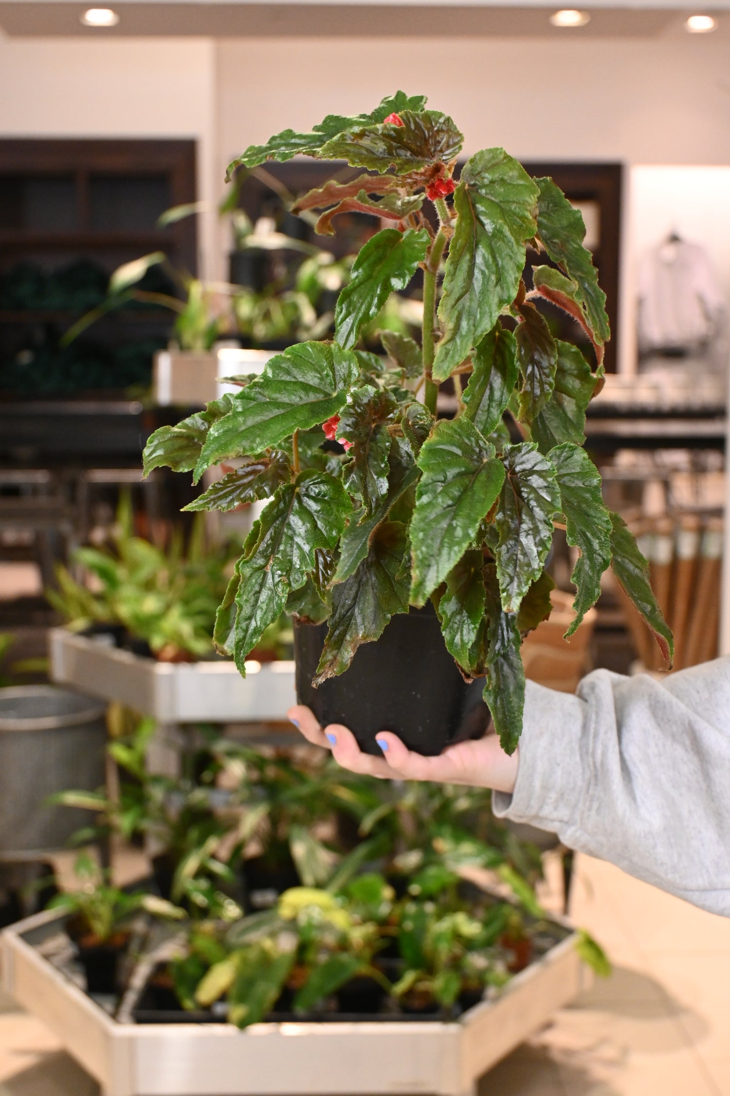Begonia thrive in medium to bright, filtered light. They prefer their soil to be consistently moist, so water when the soil is dry about 2" from the top of the pot. Keep them in a chunky potting mix.