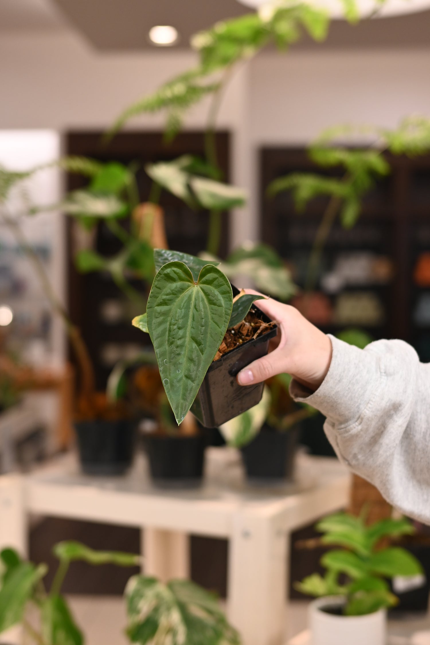 Anthurium plants are humidity lovers and thrive in a bright but filtered light space. Water them when their soil is dry about 2” down from the top of the pot. Anthurium craves an extra chunky, well draining potting mix.