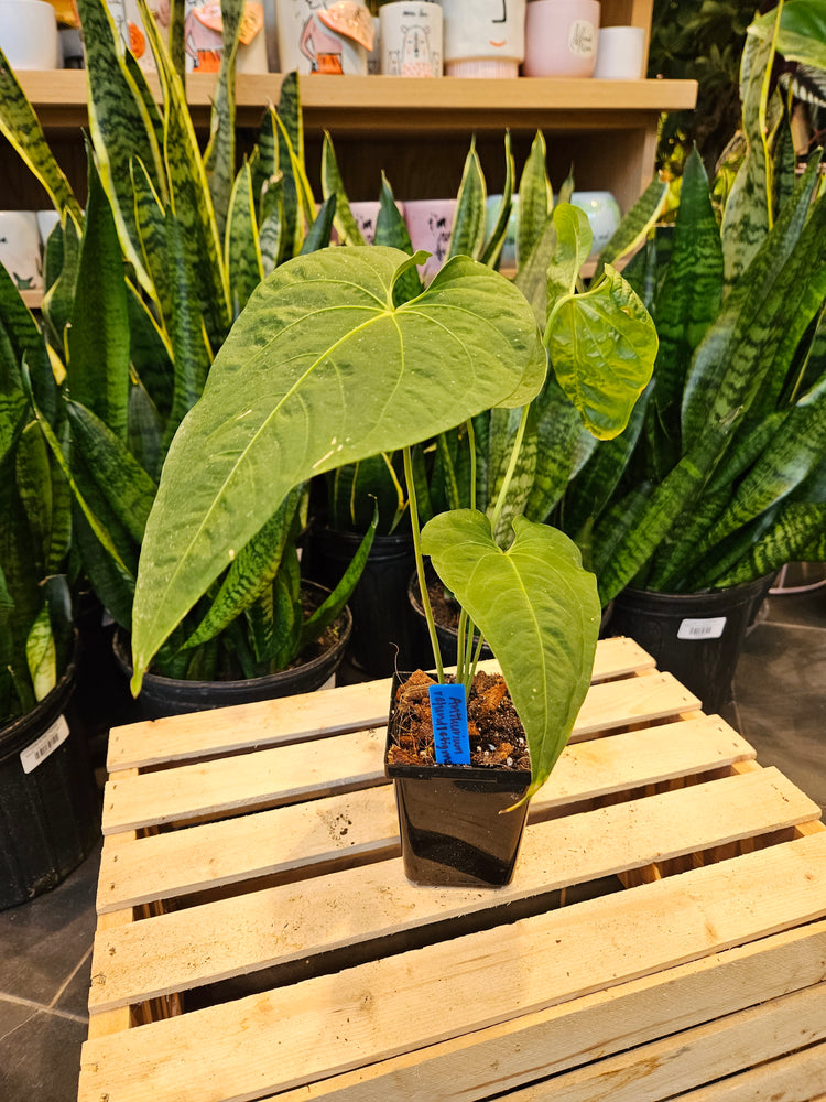 Anthurium plants are humidity lovers and thrive in a bright but filtered light space. Water them when their soil is dry about 2” down from the top of the pot. Anthurium craves an extra chunky, well draining potting mix.