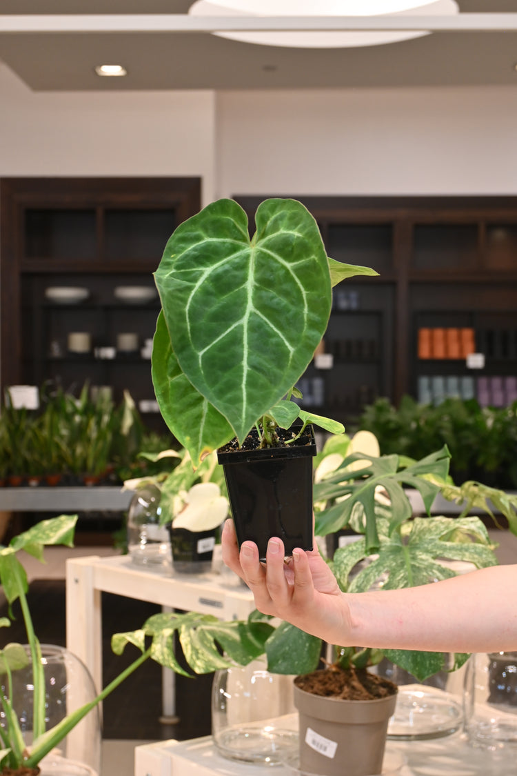 Anthurium plants are humidity lovers and thrive in a bright but filtered light space. Water them when their soil is dry about 2” down from the top of the pot. Anthurium craves an extra chunky, well draining potting mix.