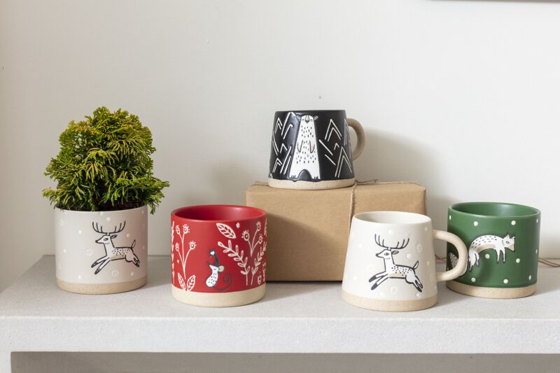 Nordic winter critters frolic across the ceramic Arwen Mug collection. Set in whimsical nature scenes, the collection includes a bounding fox, a cozy mouse, a leaping deer, and sleepy bear. A super smooth matte finish contrasts the etched and painted designs and bisque base and handle of the mug. Holds 12 fluid ounces. Mugs also make great pots for a cheery holiday plant gift.
