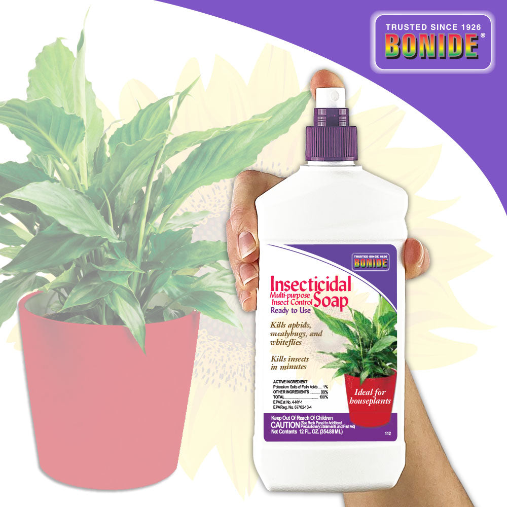 BONIDE Insecticidal Soap Houseplant Spray kills listed insects on contact. It is for organic gardening, and for use on listed houseplants, vegetables, fruits, & flowers. It can be used up to the day of harvest.