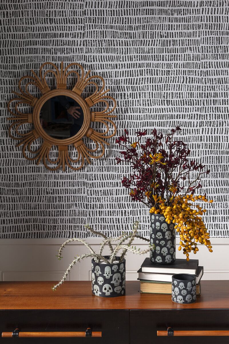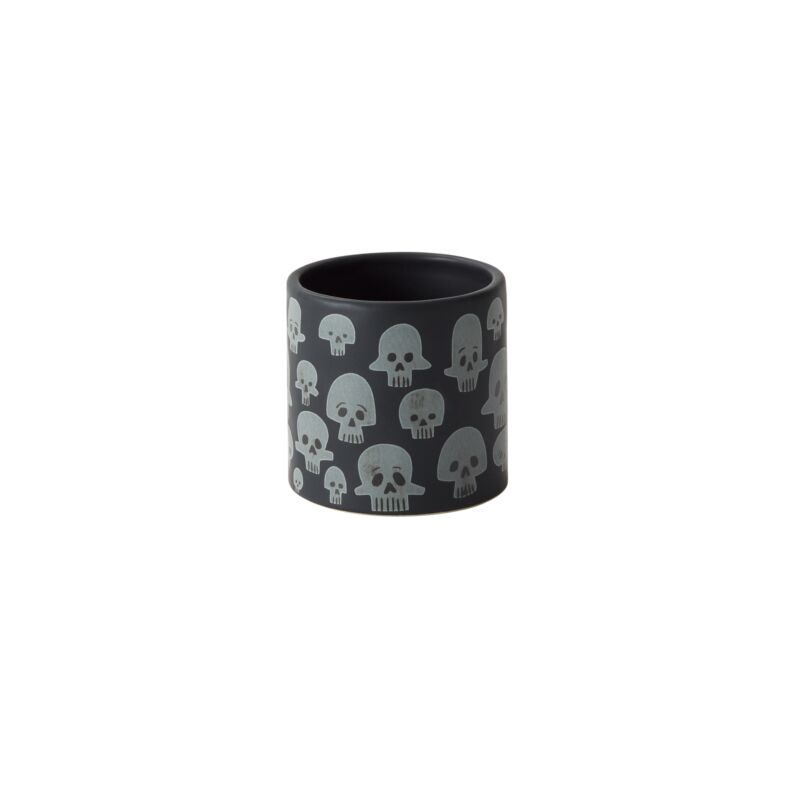 The playfully spooky Calaca Pot is a ceramic black cylinder with a pattern of white skulls decorating the outside of the pot. The Calaca can holda 3" or drop in plant.