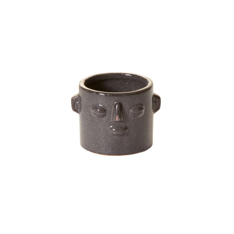 Like an old-world, totemic piece of art, the small, dimensional Ciboney Pot adds personality to plants & character to home decor with a Zen face & small tabs for ears. With a black reactive glaze on a cylindrical shape, this sculptural vessel has some surface variation for an individualized look. Fill with florals or a drop-in plant, or arrange among books & objects as part of a shelf display.