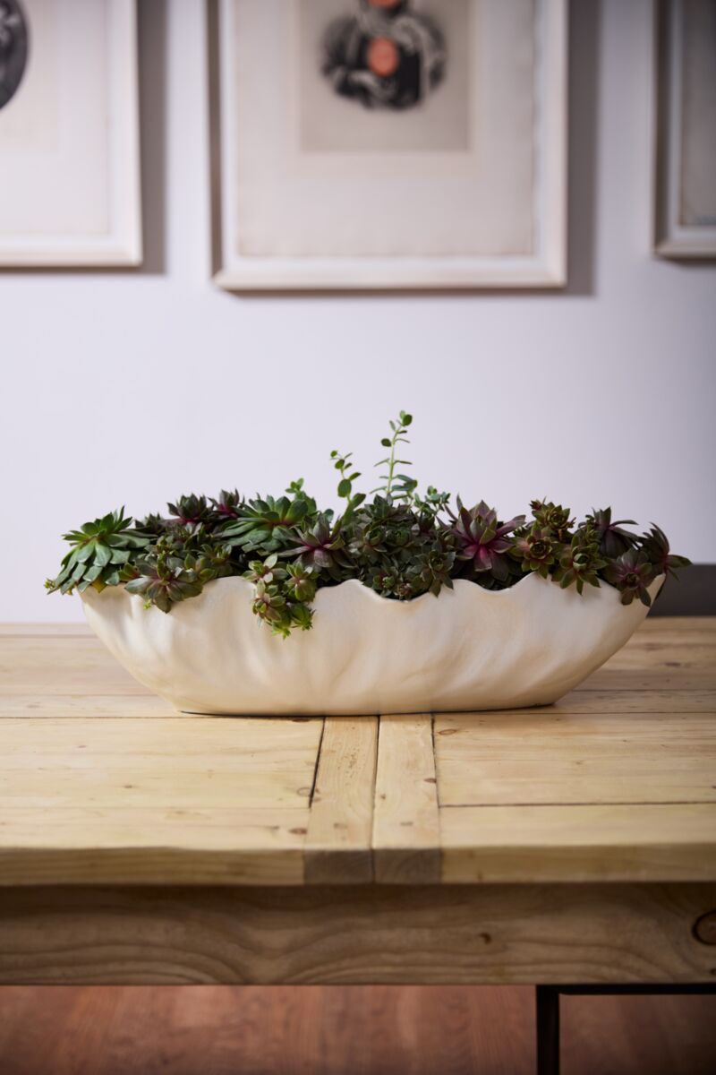 Celebrate artisanal style with the elongated wide ceramic Coastline Trough. Featuring an organic ruffled rim & a warm white reactive glaze that provides variation in the finish, this piece makes a lovely long centerpiece for floral arrangments, orchids, other blooming plants. The dimensions allow for any type of floral mechanics. This home decorative accent piece is a lovely display for a console, coffee table, or dining table.