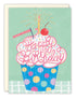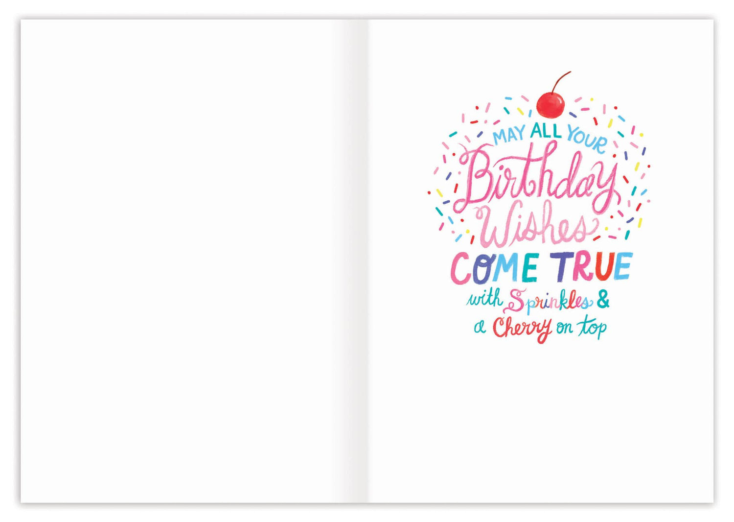 Inside verse: May you birthday wishes come through with sprinkles & a cherry on top. • Size: A6, 4.6" x 6.4" • Illustrated by Kenzie Kae Elston • Treatment: Gold Foil • Envelope color: Warm White • Printed in the USA on 100% post-consumer recycled paper.