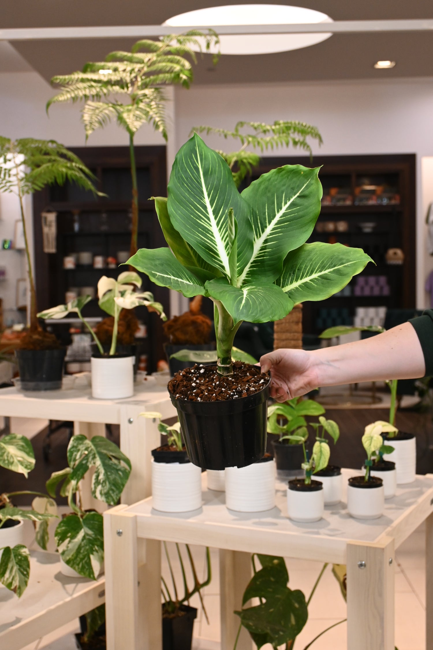 Dieffenbachia plants prefer their soil to be consistently moist & thrive in a filtered light environment with a touch of humidity.