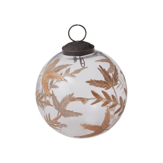 The beauty of nature is celebrated in the Forage Ornament, a glass Christmas ornament with gold leaves etched around on the clear glass surface. Finished with a metal top and loop, the Forage Ornament is a elegant Christmas decoration.