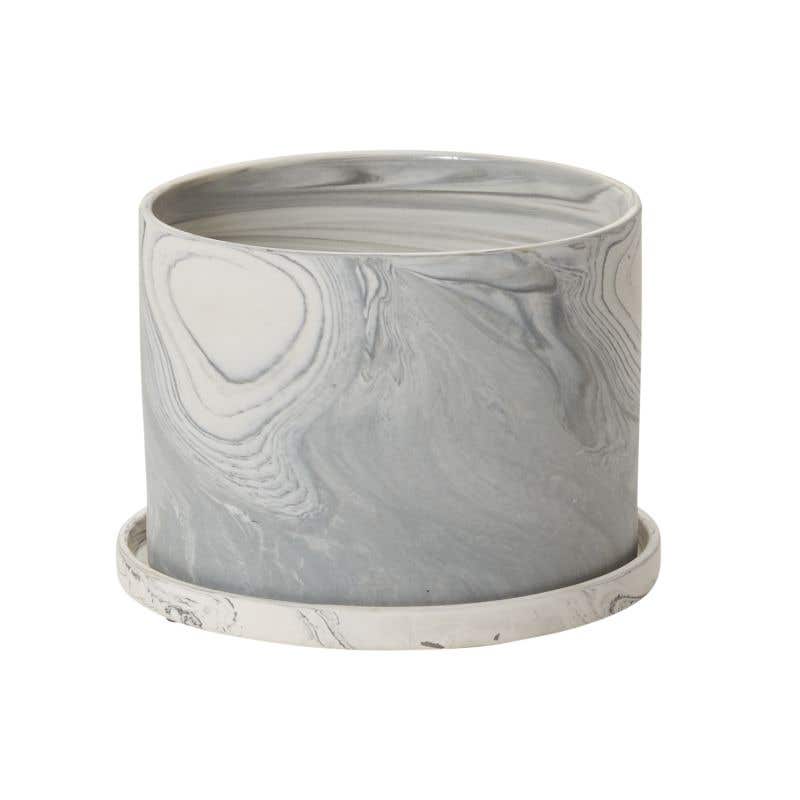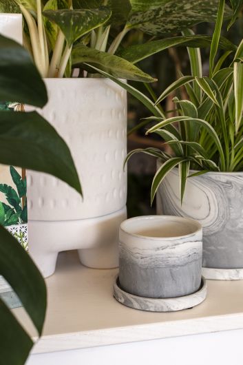 A simple silhouette and slim saucer are the ideal backdrop for a unique marbled finish of white and gray clay. Modern vibes make the Marengo Pot a stylish addition for your home and an elegant pot for every plant.