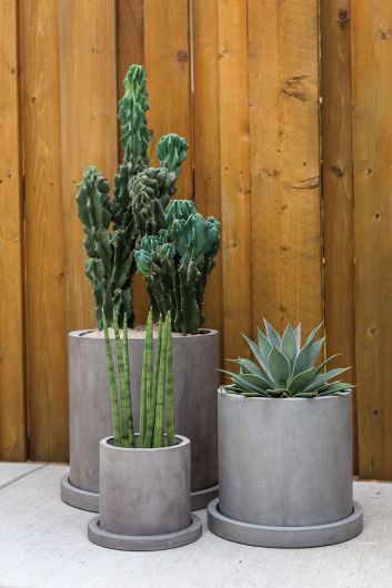 In clean grey concrete, the Marta Pot features a drainage hole and saucer with a contemporary shape, designed for outdoor use.