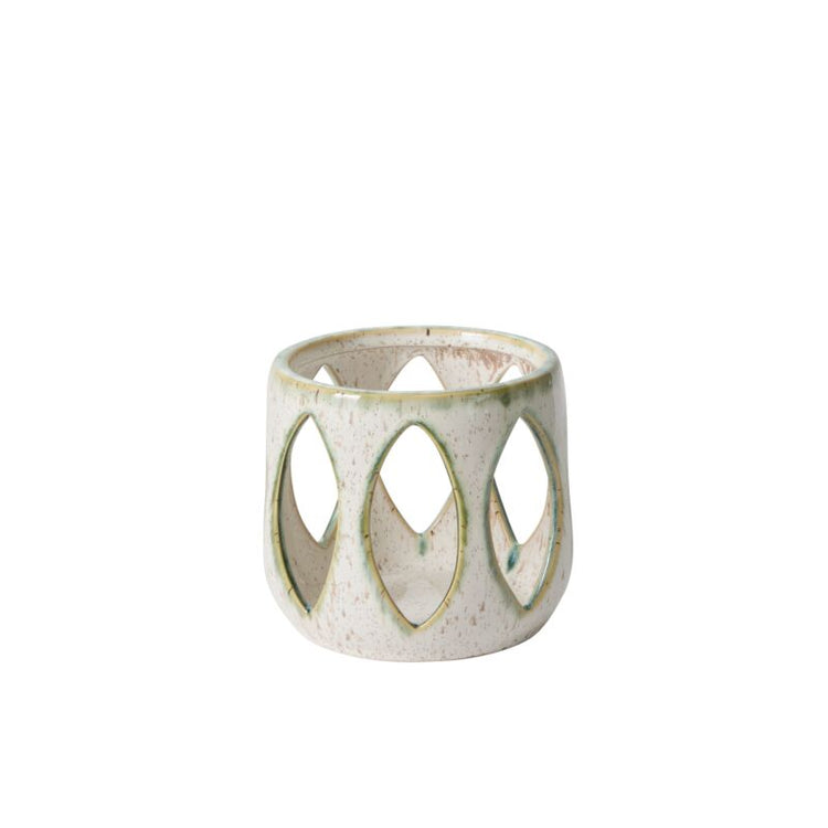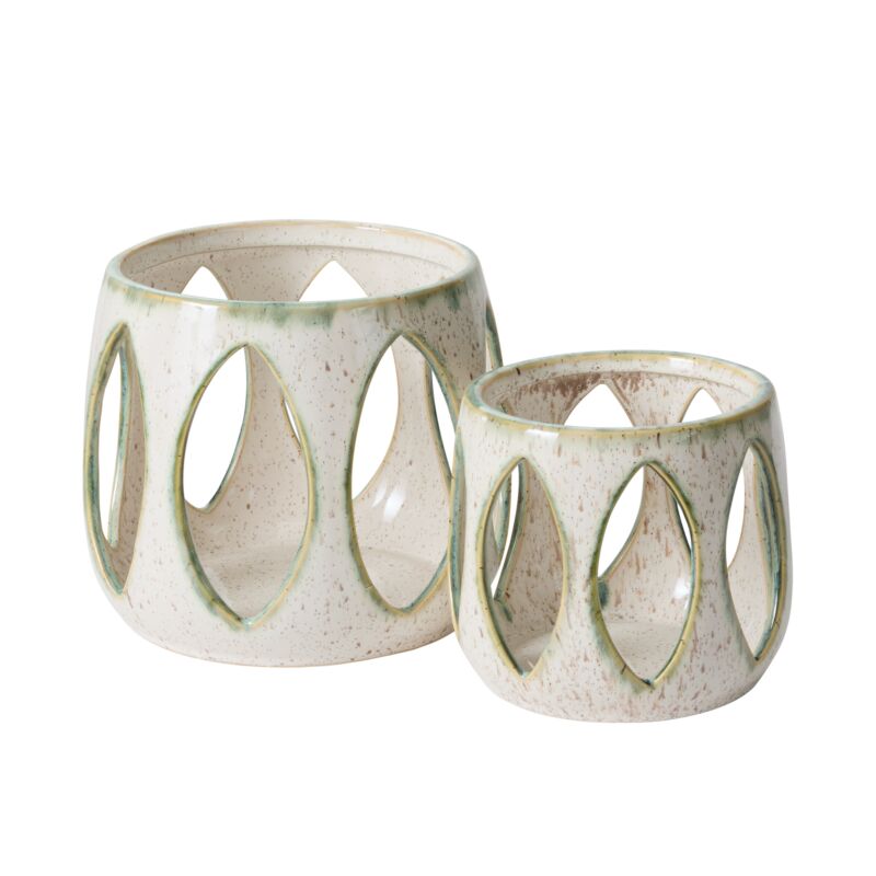 Wide open spaces are just what an orchid needs to grow and thrive. The Minka Orchid Pot has rounded diamond shaped cut outs all around for orchid roots to strech out and get fresh air. With a lightly speckled white ceramic ground that is trimmed in a soft green hue, the Minka promotes healthy growth for a 4.5-inch drop in orchid or other variety of plant. Style the 2 sizes of Minka together or even use to hold a pillar candle for a warm glow.