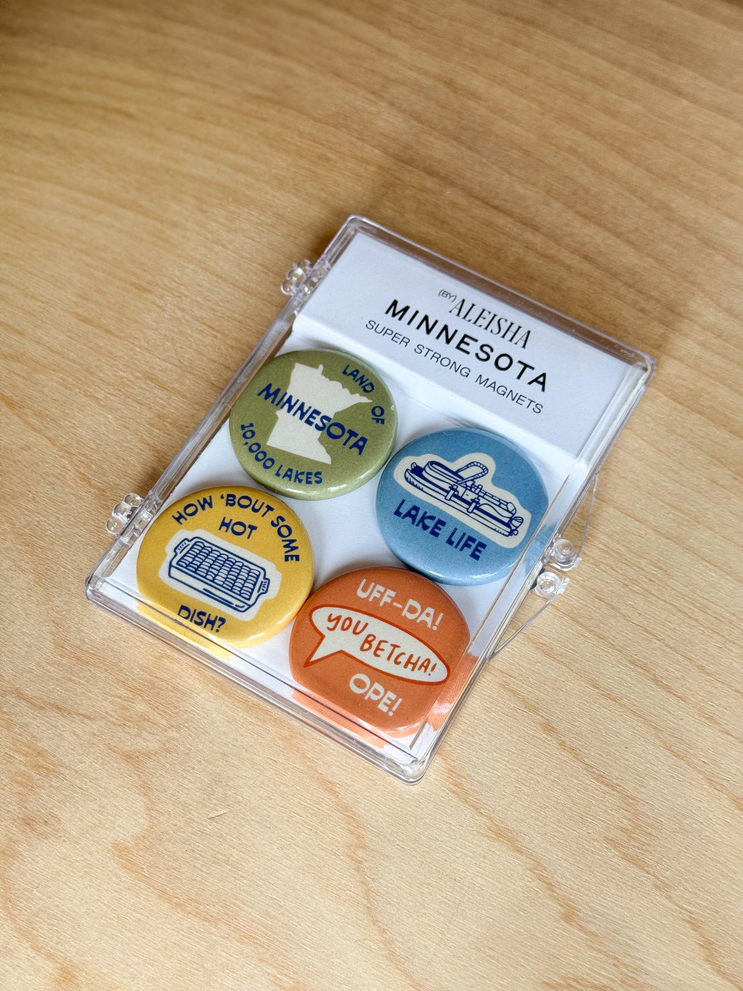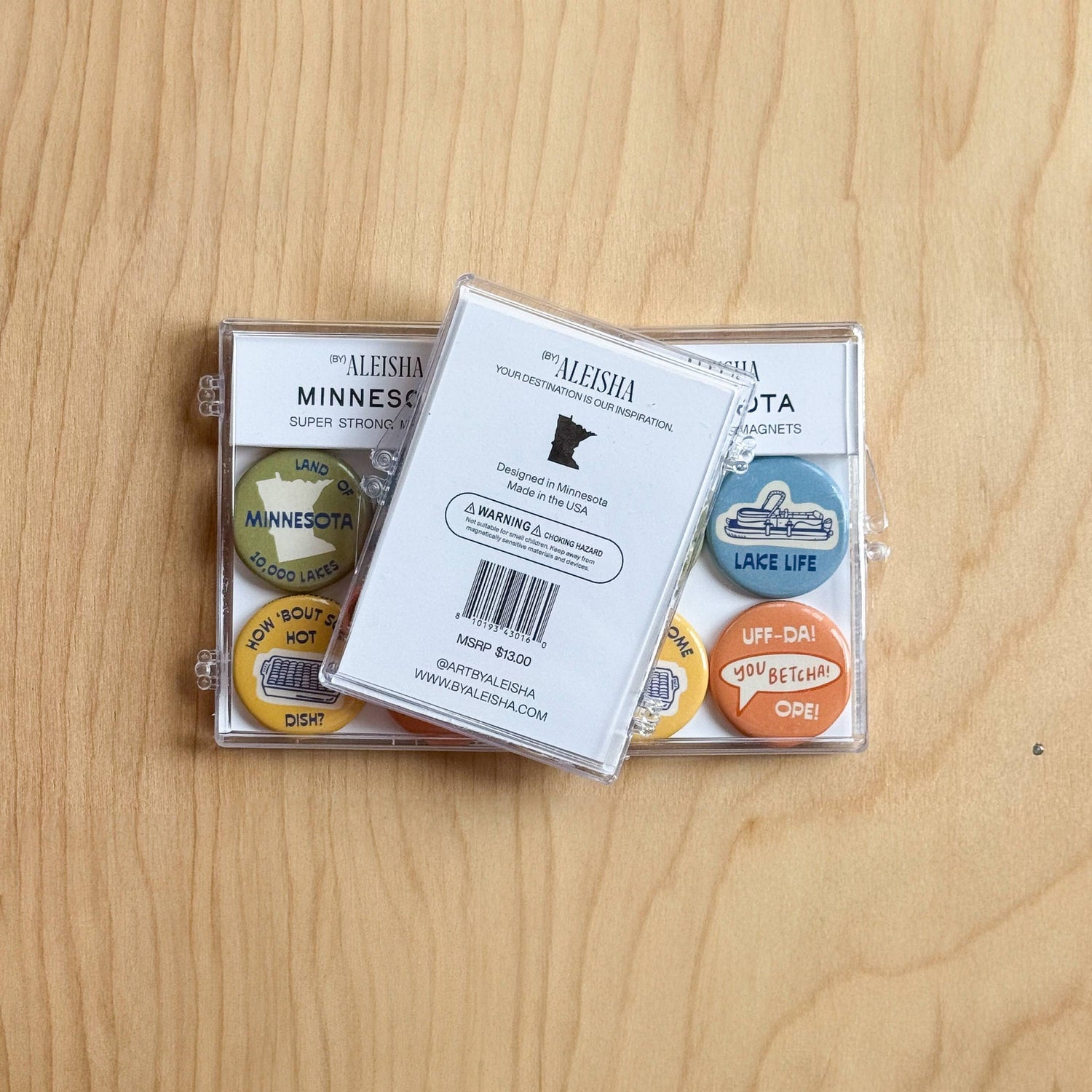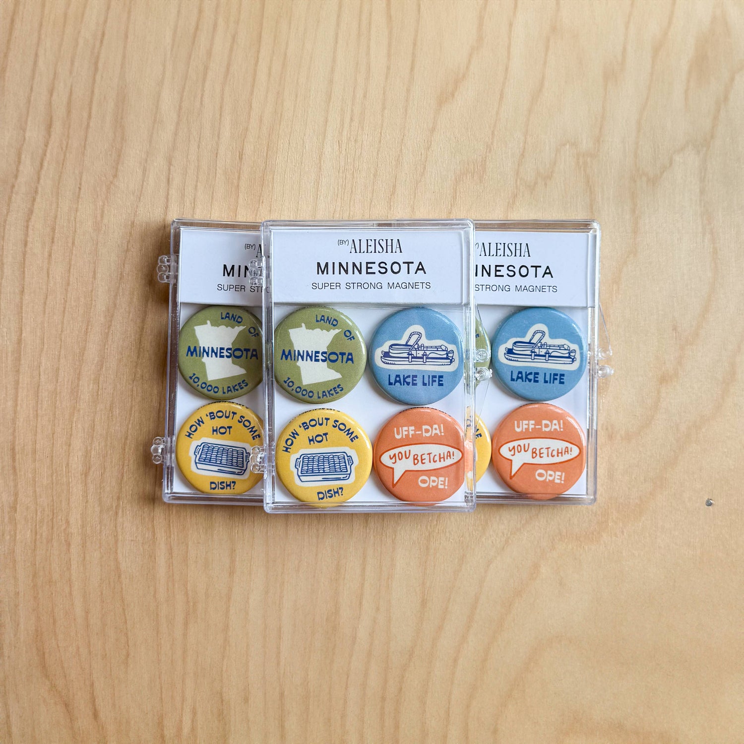 Bring the charm of Minnesota home with you. This set of 4 super strong magnets will add the perfect flair to your fridge, filing cabinet, or locker. The best part is that they're so strong they will *actually* hold up those cards and flyers you get in the mail!