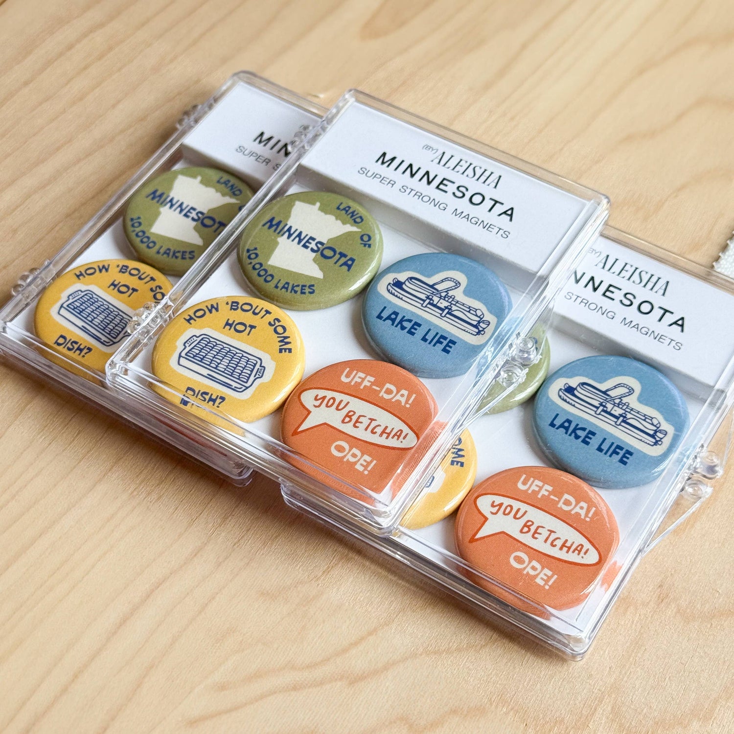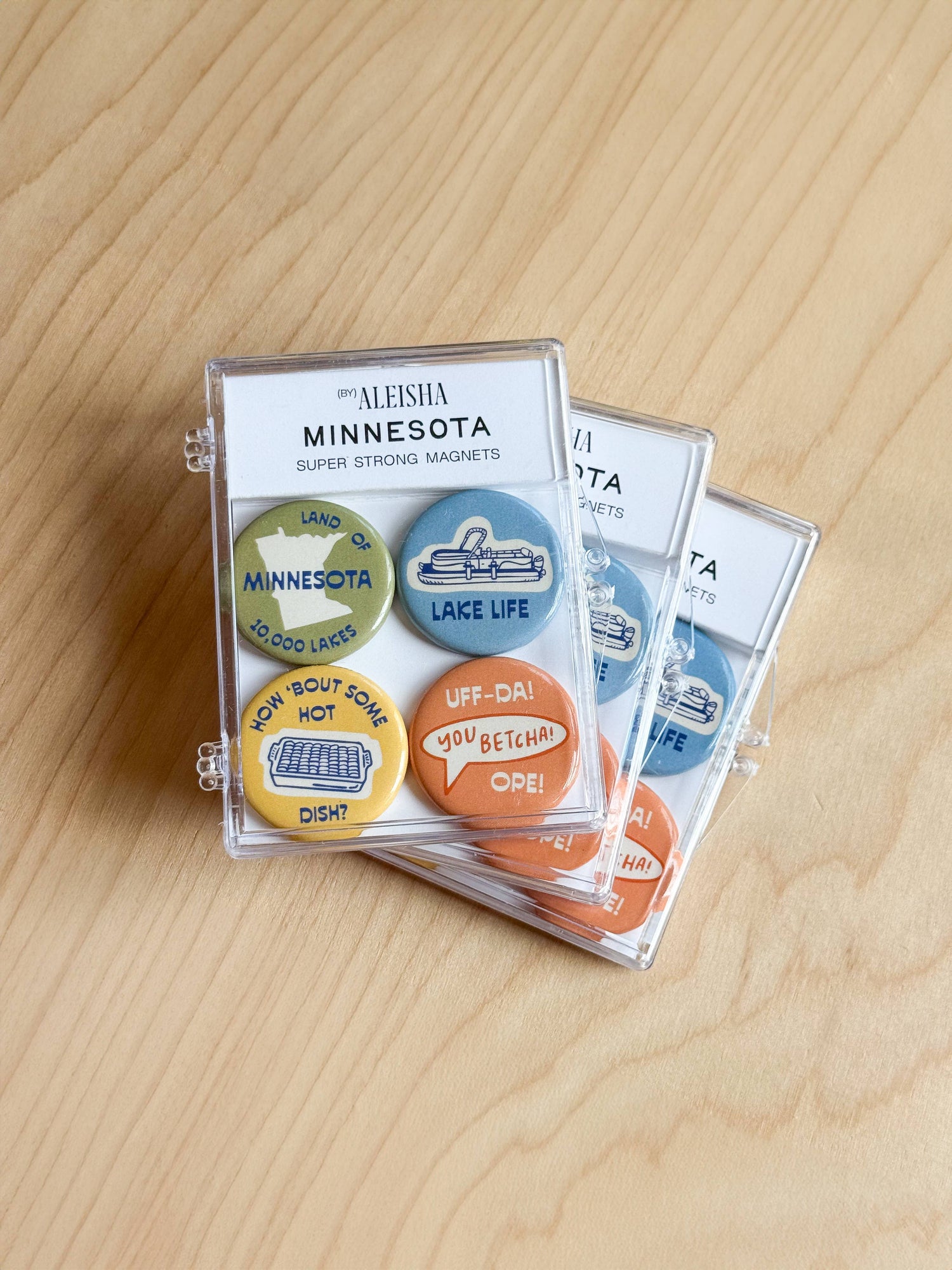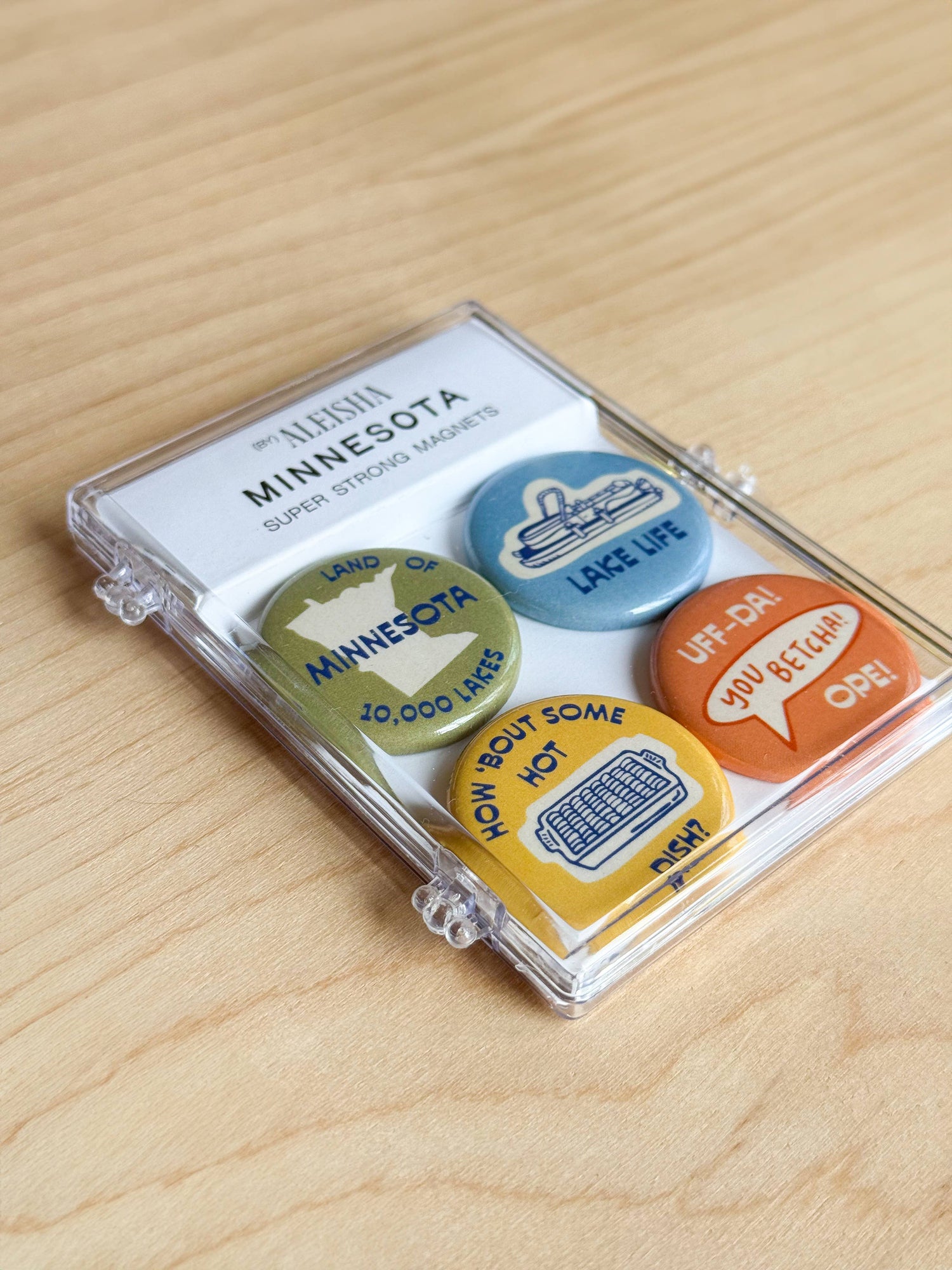 Bring the charm of Minnesota home with you. This set of 4 super strong magnets will add the perfect flair to your fridge, filing cabinet, or locker. The best part is that they're so strong they will *actually* hold up those cards and flyers you get in the mail!