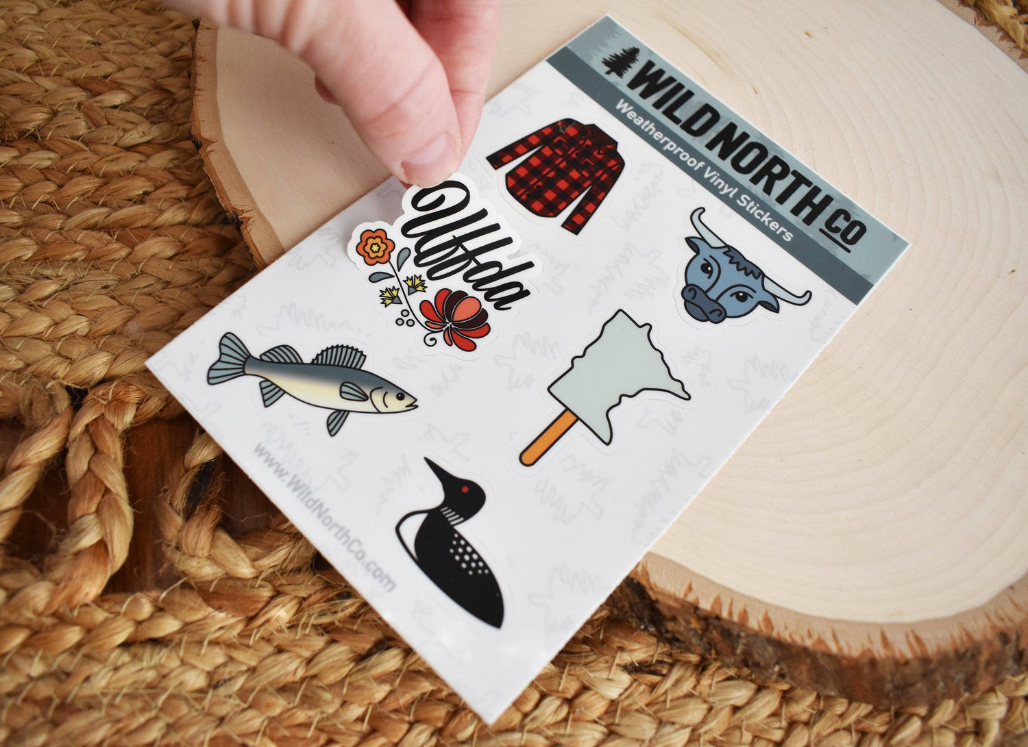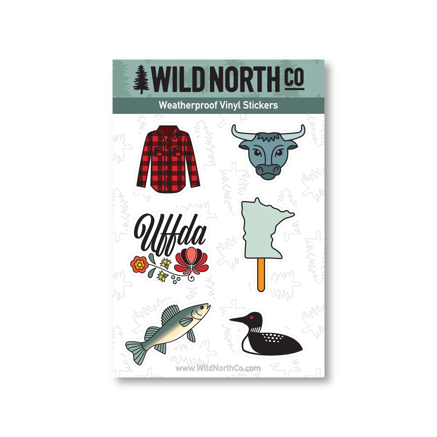 This Minnesota Sticker Set is all things Minnesota! Including a buffalo plaid flannel shirt, babe the blue ox, a Scandinavian inspired uffda, Minnesota on a stick, a walleye, and a loon!