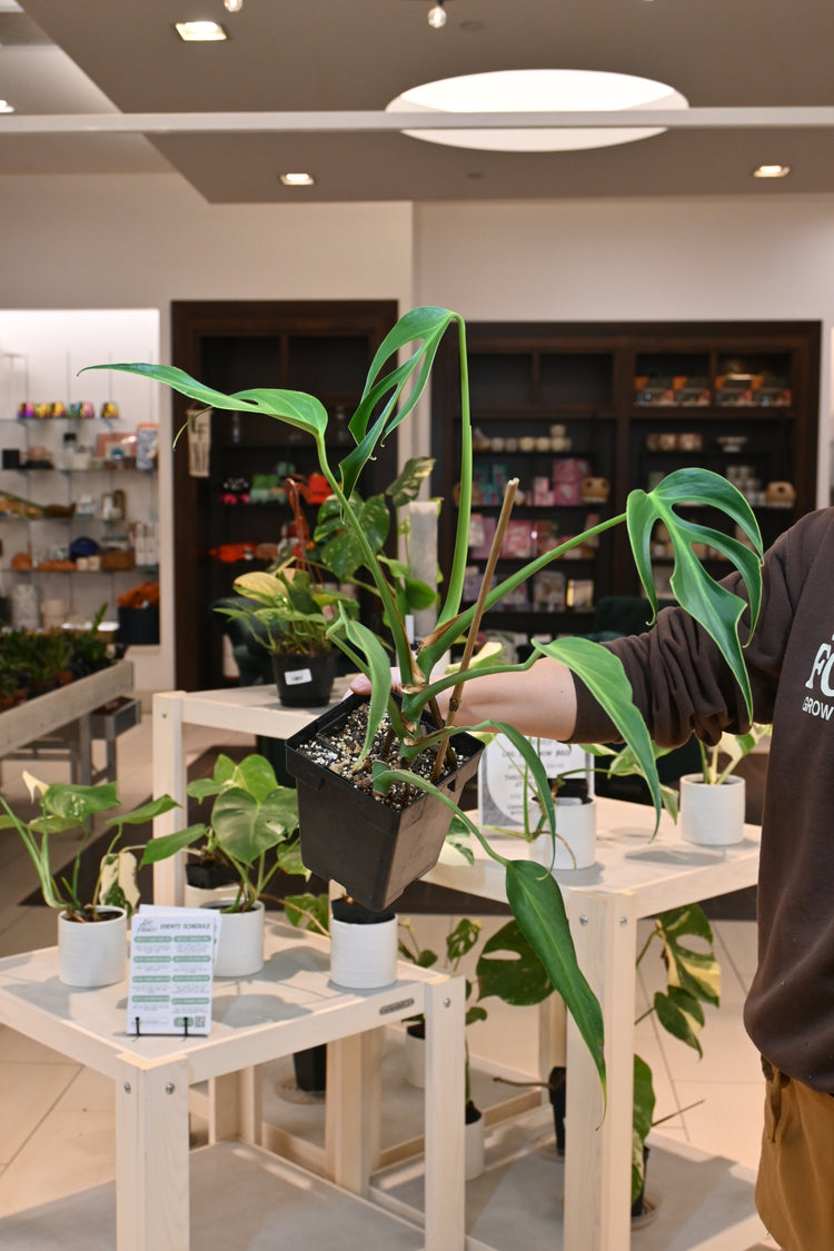 Monstera plants prefer bright, but filtered light & want to be watered when their soil is about 50% dry. Keep your Monstera plants in a chunky potting mix.