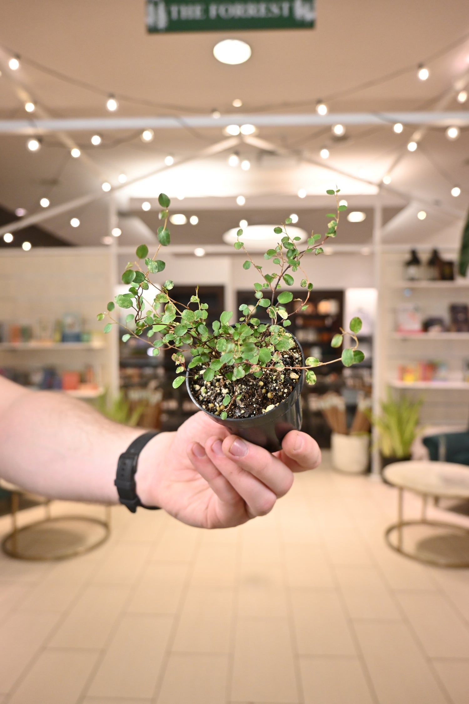 Muehlenbeckia axillaris ‘Tricolor’ has glossy dark green leaves, variegated with white and pink, growing on wiry stems. This easy-going plant likes any well draining soil & indirect light, and forms a trailing mat of foliage.