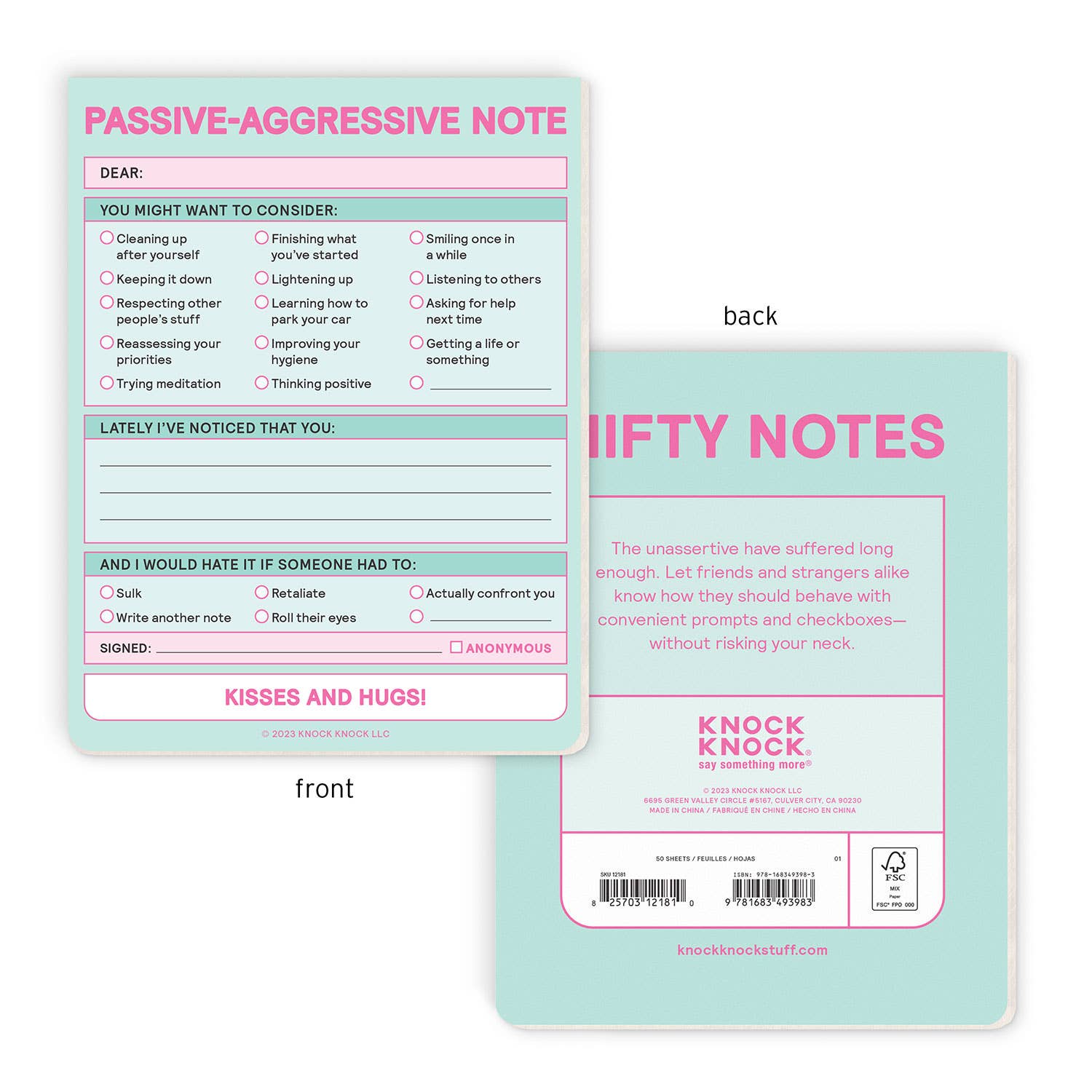 Express yourself the thinly veiled way! This passive-aggressive paper tantrum notepad lets you clearly but (somewhat) subtly address a range of behavioral failures in others including poor attitude and lackluster hygiene. Great for communication between roommates and coworkers!