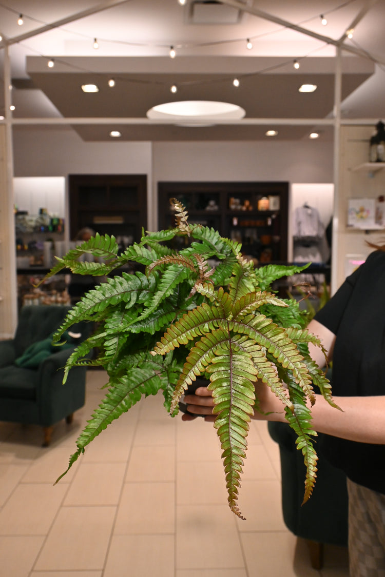 Ferns crave a lot of humidity & bright, filtered light. Allow their soil to dry out about 50% between waterings.