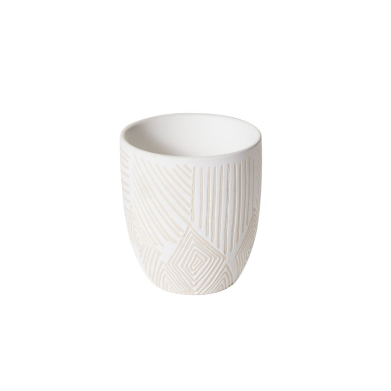 The understated subtlety & artistry of the small ceramic Pfiefer Pot offers a calming spot for the eye to land. Made with a resist inlay technique to create the white glazed pattern on the natural clay pot, the textured design offers dimension. Add color to this watertight indoor planter with a drop-in plant or small floral arrangement.