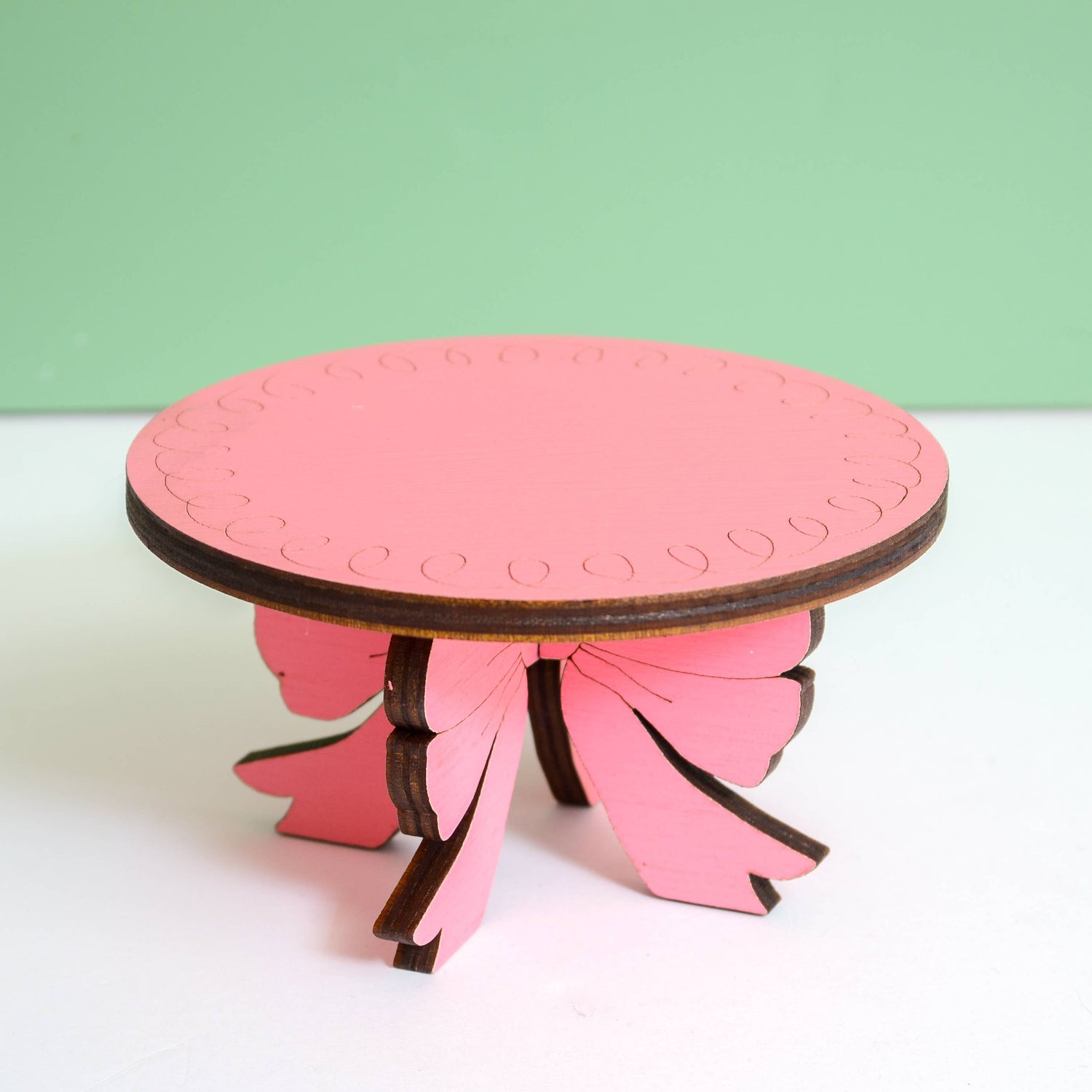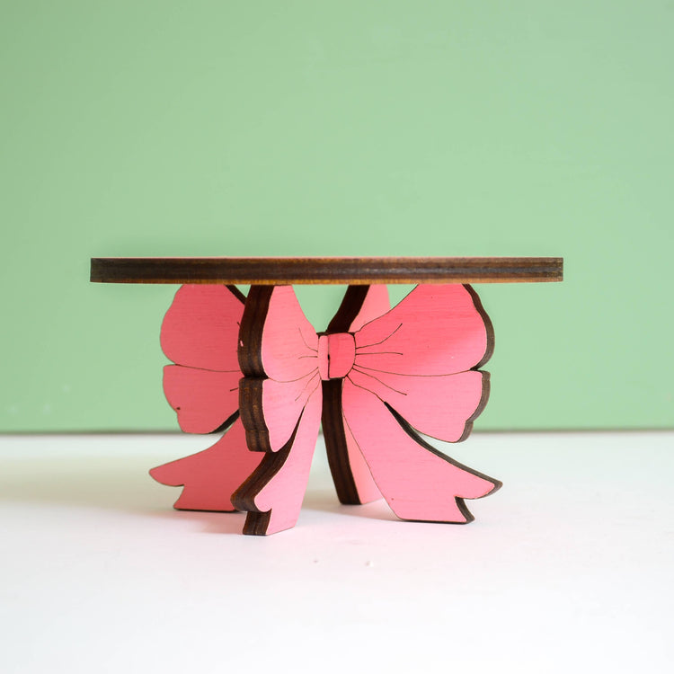 Add a touch of sweetness to plant displays with this adorable bow-shaped plant stand. Featuring laser-cut ribbon bow legs in a cheerful pink finish, it brings playful charm to any space while elevating plants beautifully. Product Details: Dimensions: 5" wide x 2.75" tall Laser cut from 1/4" thick wood Pink painted finish with detailed bow design Water-resistant polycrylic coating for durability. Fits 4" pots and smaller perfectly. Hand-painted and assembled with care Unique bow-shaped support legs.