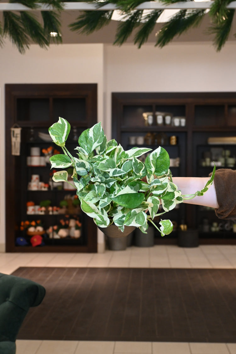 Pothos, Epipremnum, Scindapsus plants are some of the easiest out there. They can tolerate low light, and are drought tolerant. Water when the soil is dry about 50%. Keep them in a well-aerated soil.