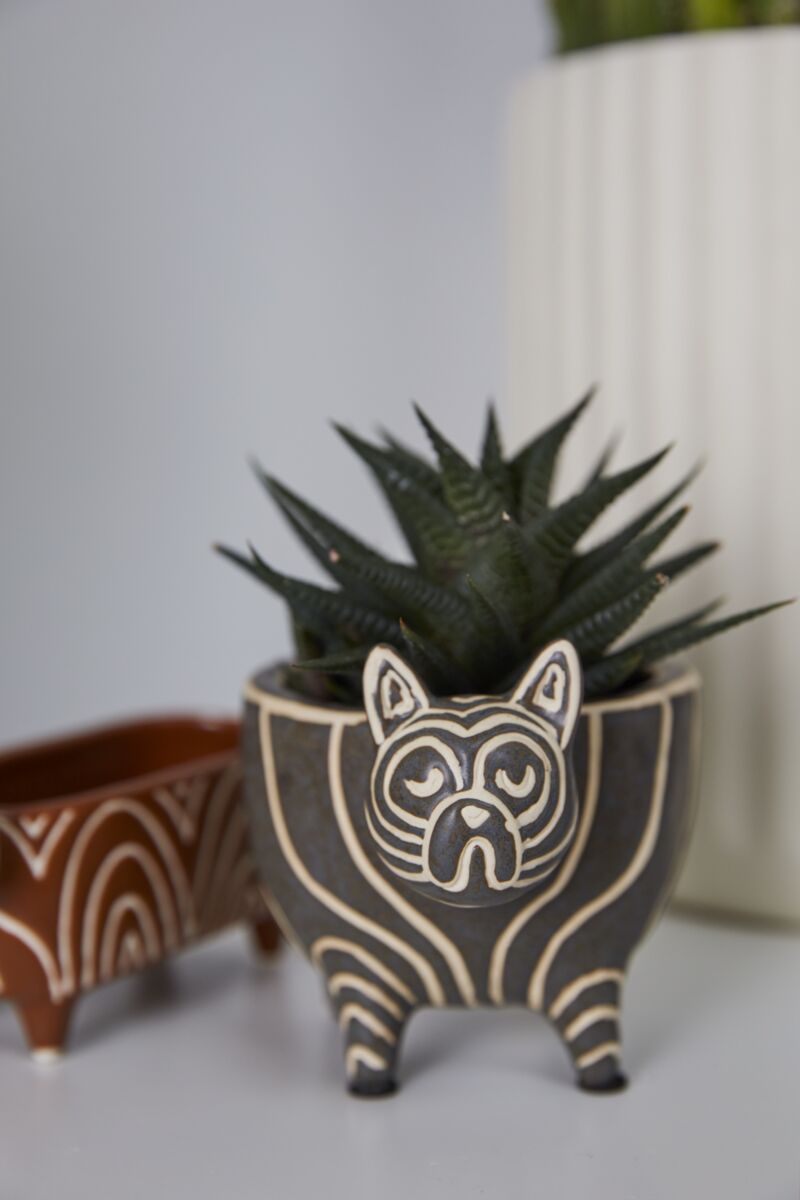 The sweetest ceramic Frenchie there ever was, this Puppy Love Pot is a fun, non-snoring alternative to a snuggly French bulldog. This quirky critter pot features a black glaze on a white base with etched linework. Charming details include short little legs, tiny ears, & a delightful nub of a tail. The perfect gift for a pet parent & plant lover, this playful watertight pot accommodates a small, 3-inch drop-in plant.