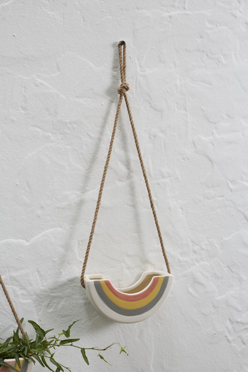 The Rainbow Hanging Planter is a curved ceramic planter with a muted trio of colors applied to a white base.