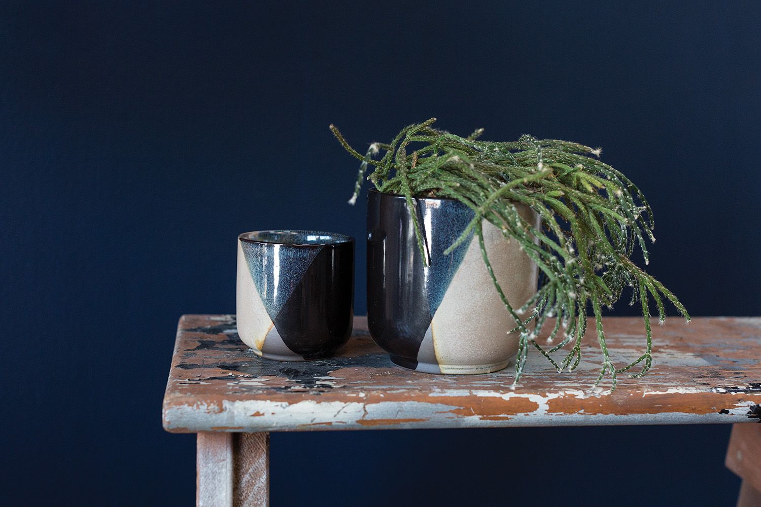 The unique finish of the Retro Pot is crafted from black clay with white and black glaze in a geometric pattern for a modern look. Made to fit a 4" drop-in pot.