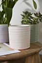 Subtle texture and playful color combine to make the Roux Pot a soft but punchy option for any 4-inch standard drop in plant or bunch of fresh cut florals. This stoneware pot has slight horizontal ribbing that gives the feel of a hand pulled vessel, and the price point of one to stock up on all year round. A reactive pale pink glaze pairs with almost any floral palette and feels fresh when styled alongside the purple and green colorways of the Roux Pot.