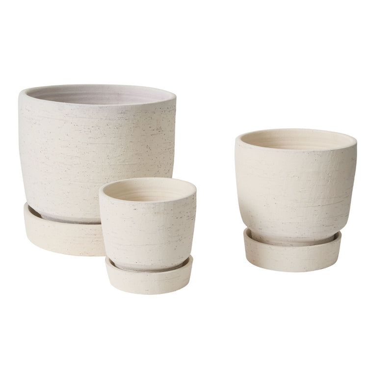 Embrace both style and sustainability with the Salvage Collection, made from recycled terracotta and hand painted in warm white. Dried, broken bits of natural terracotta that are remnants from broken pots are crushed and mixed in with smooth clay, creating a surface texture with grit and dimension in each piece.