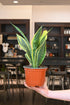 Sansevieria are low-maintenance, and easy-going. They tolerate low light and low humidity. Allow their soil to completely dry out between waterings.
