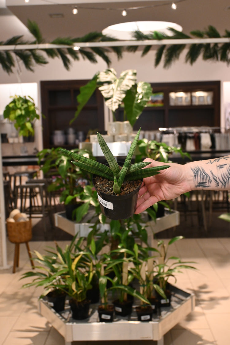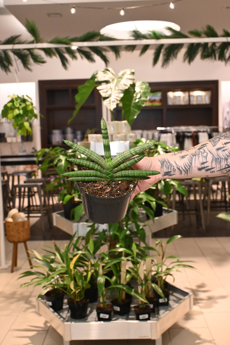 Sansevieria are low-maintenance, and easy-going. They tolerate low light and low humidity. Allow their soil to completely dry out between waterings.
