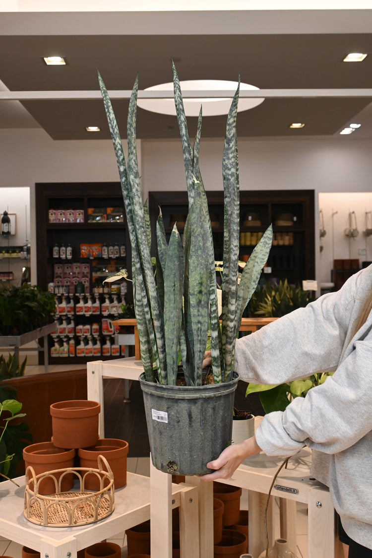 Sansevieria are low-maintenance, and easy-going. They tolerate low light and low humidity. Allow their soil to completely dry out between waterings.
