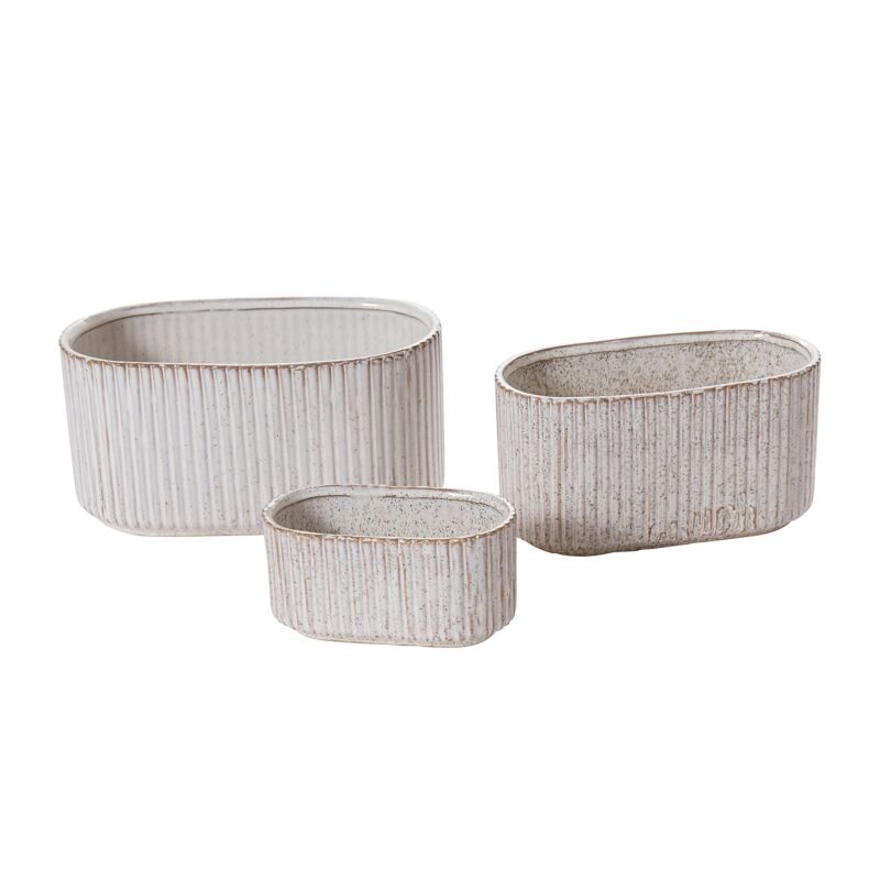 The Stable Planter comes in an oblong shape with a small footed pedestal bottom and ribbed glazed finish in the perfect shade of cream. A lined glossy pattern serves as the perfect backdrop for every plant.