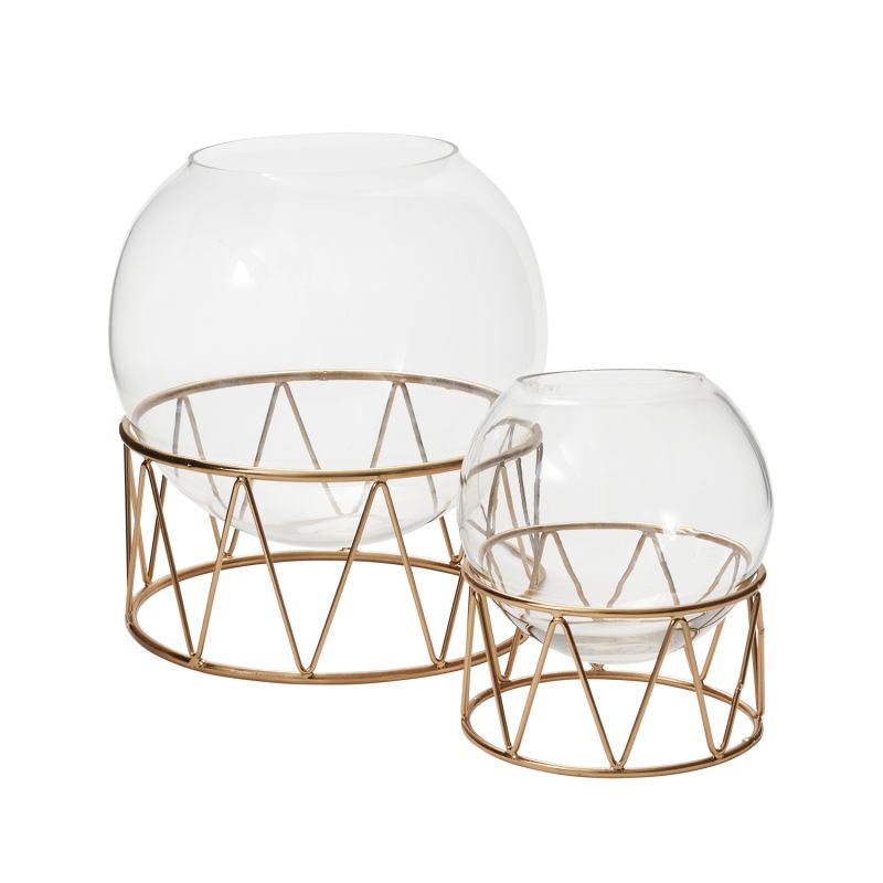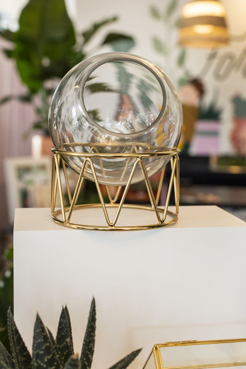 The Taro Terrarium combines the best of today’s trends with a gold finished geometric base and a glass orb terrarium for displaying plants and succulents in style.