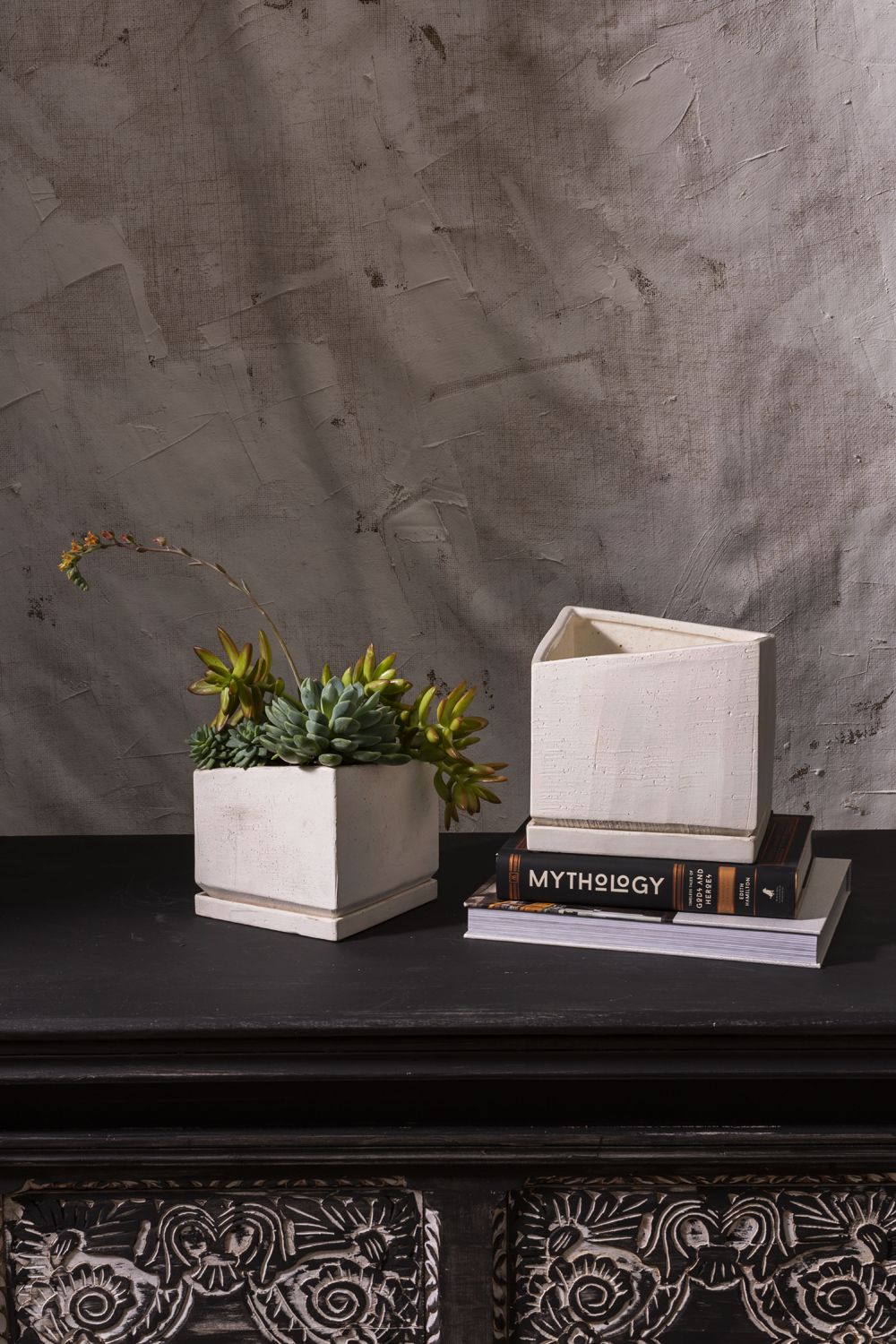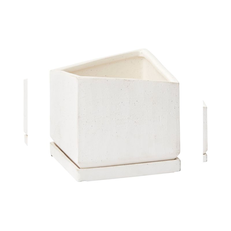 The unique shape of the Tevy Pot makes it a modern versatile option for the garden. Including a drainage hole and saucer, the white glazed finish and geometric design offer an updated look for all your favorite plants and patios.