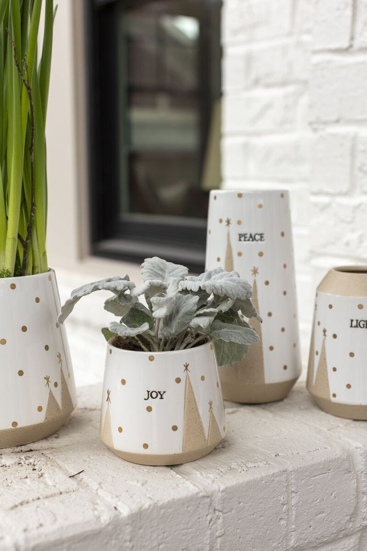 A wintry scene of neutral trees and gold metallic dots wrap around the Treeline Pot. The base of the vessel is a warm speckled bisque, and a glossy white glaze is hand painted to create triangular trees in relief. Words of holiday encouragement are painted in black on the front of the pot.