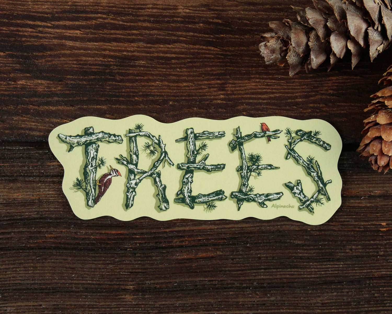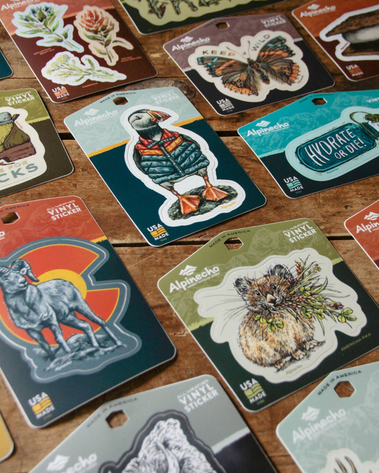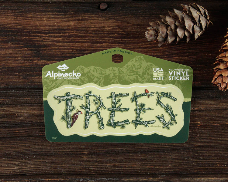 We love them, the birds love them. Who doesn't love them? Support your local trees! Alpinecho weatherproof stickers are made from the same vinyl found on car wraps, so they’re tough and durable. We love their vivid colors, UV protection, and dishwasher-safe guarantee. These stickers might be tough against the odds, but they’re always gentle on surfaces like cars, water bottles, and laptops. They’ll stick around as long as you like, but peel away as soon as you’re ready for our newest design. The perfect addition to your water bottle, laptop, skis, snowboard, vehicle, or anything else that needs a touch of the outdoors. • Size: 2" H X 5” W (sticker only, not including backing material) • UV-protective layer, waterproof, and dishwasher safe • Removable, non-damaging vinyl die-cut decal/sticker • 100% made and printed in the USA