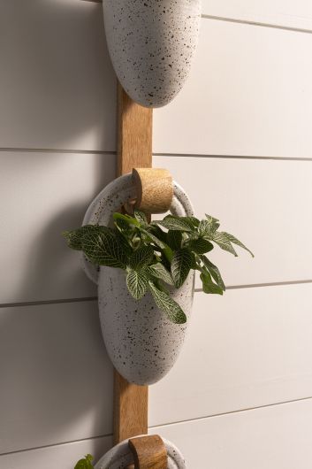 The Trivalent Hanging Pot is natural clay twice glazed for a white speckled finish. This pot is designed to hang by its dual coil, and sports a uniquely modern silhouette perfect for completing every plant.