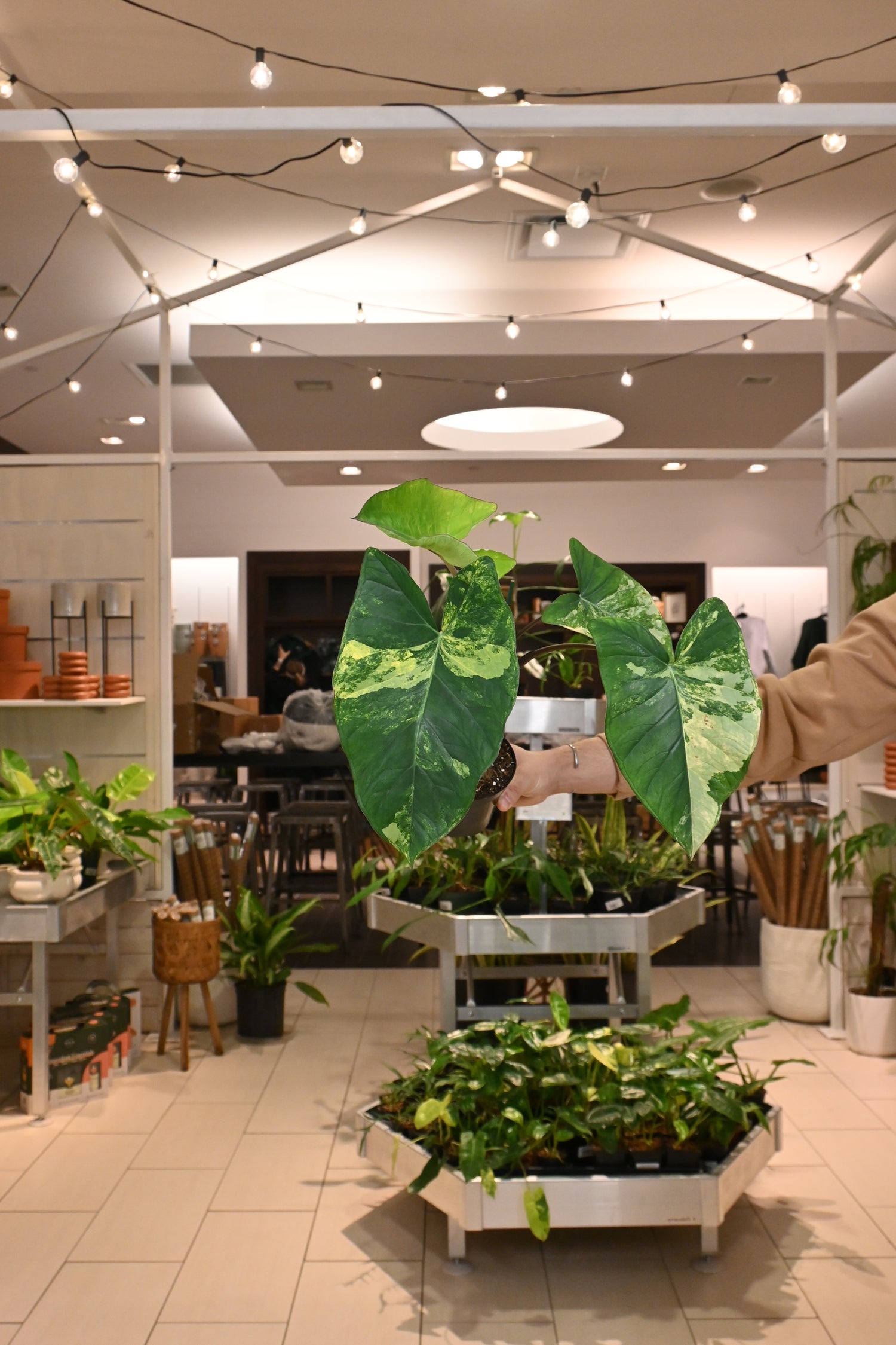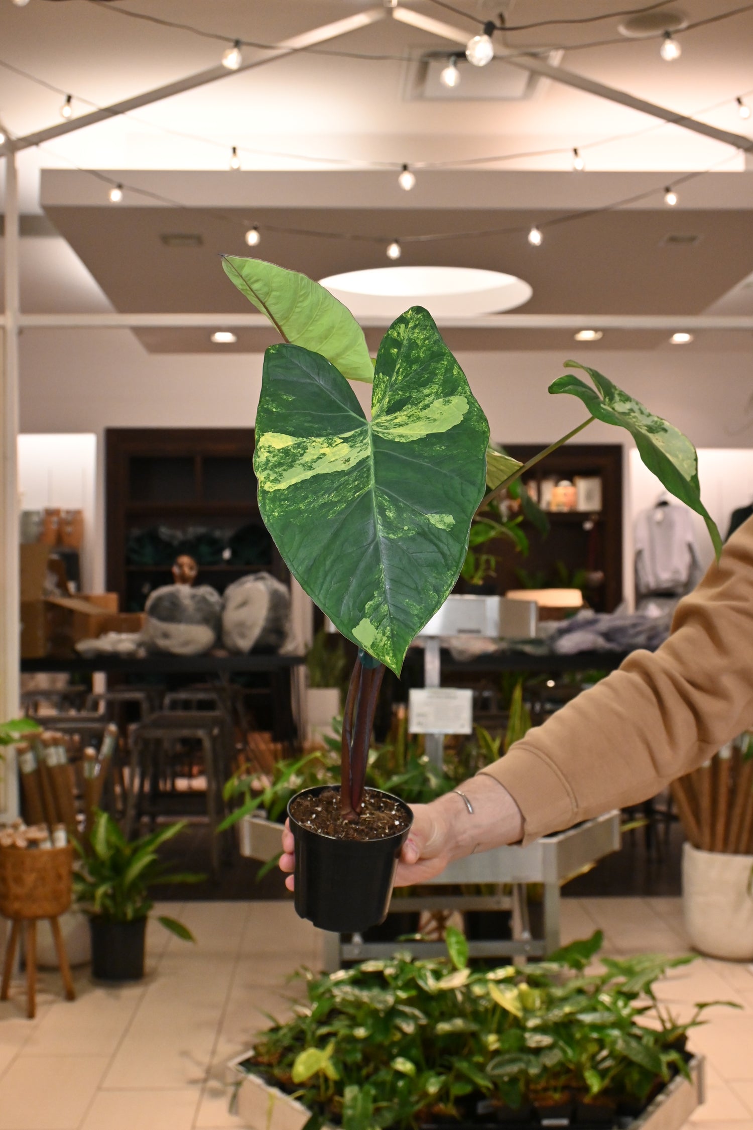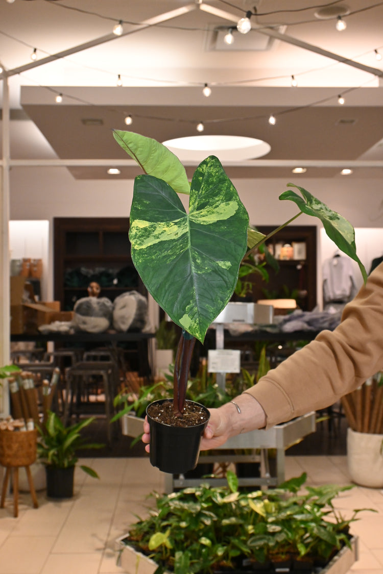 Xanthosoma sagittifolium 'Frozen Planet' boasts large, leathery leaves with a unique variegated pattern, resembling frozen dew on dark stems. Bright indirect light.