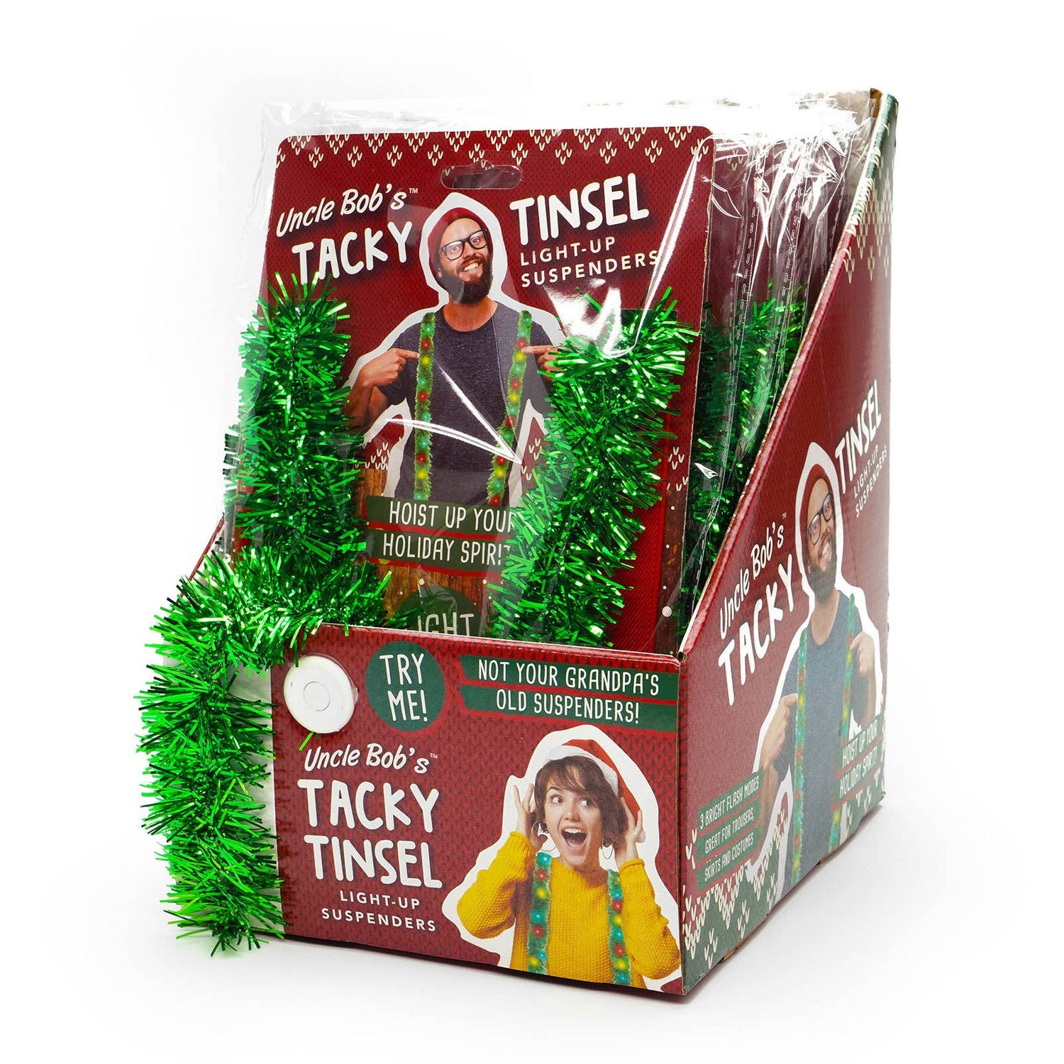 Hoist up your holiday spirit with flashing garland suspenders! This tacky undergarment is fully functional with adjustable straps and metal clips, and fully festive with colorful LED accent lights. Not your grandpa’s old suspenders! -3 flash modes -Easy-on/off button -Trousers, skirts & costumes galore!