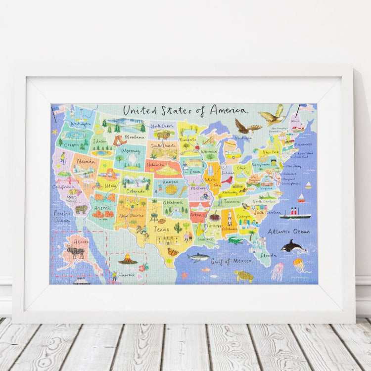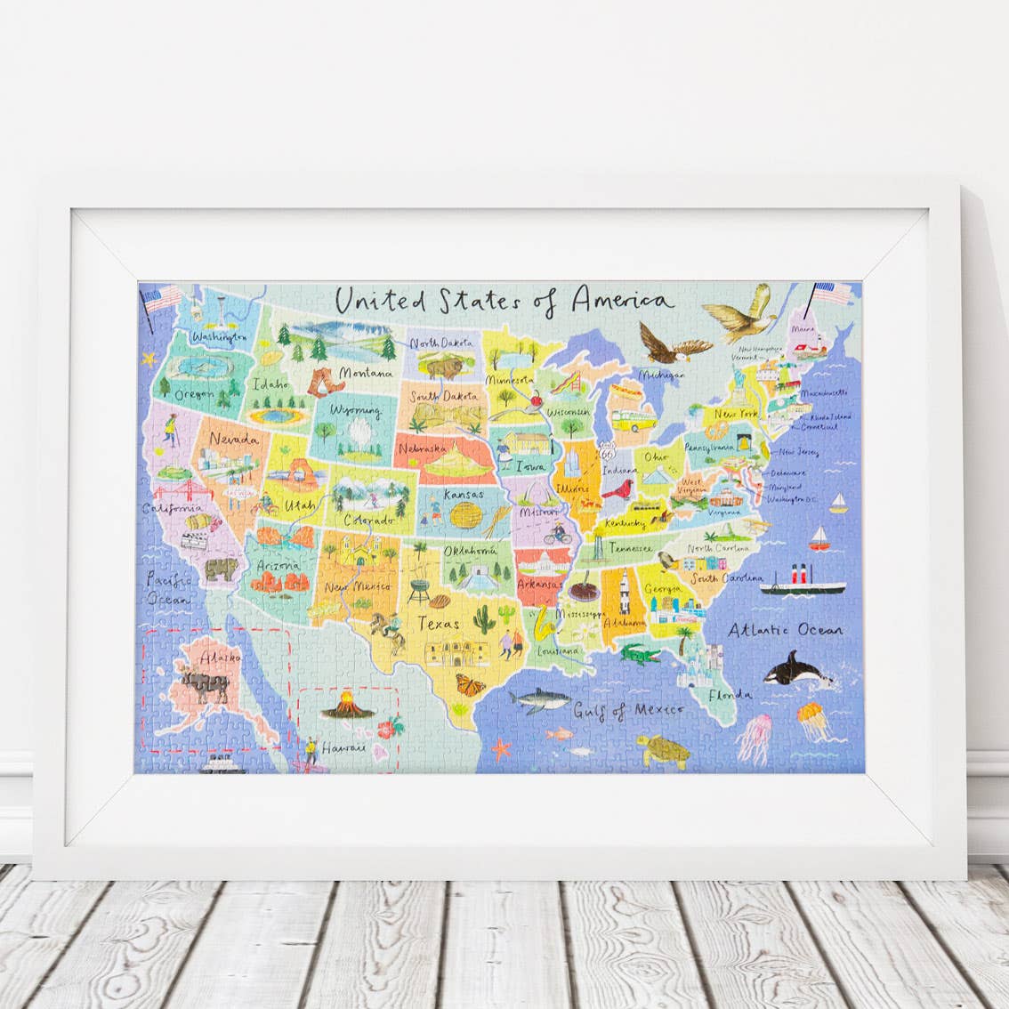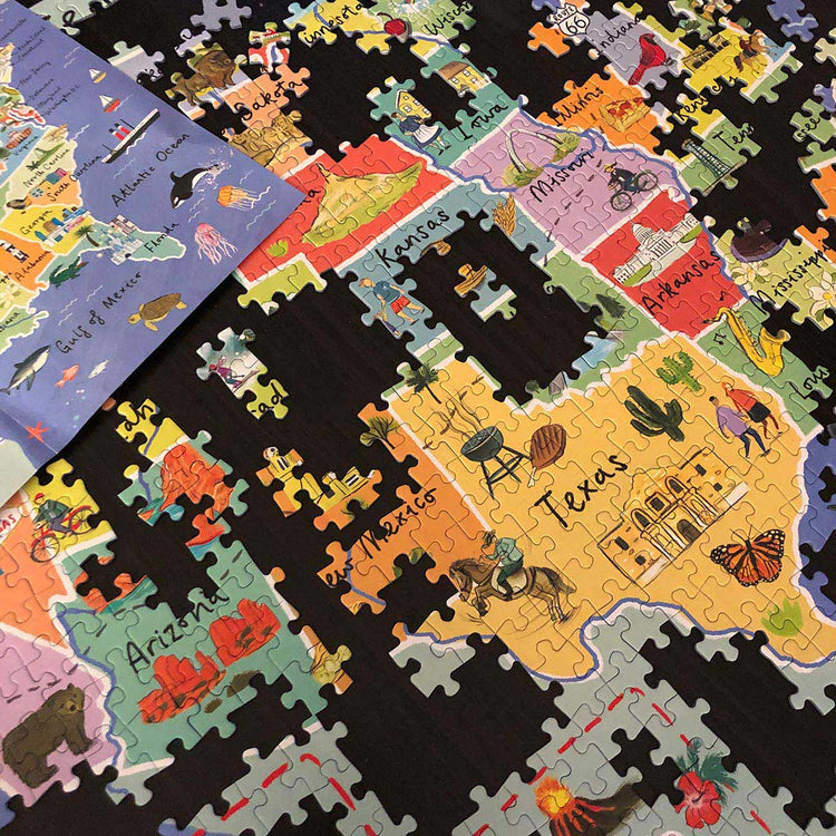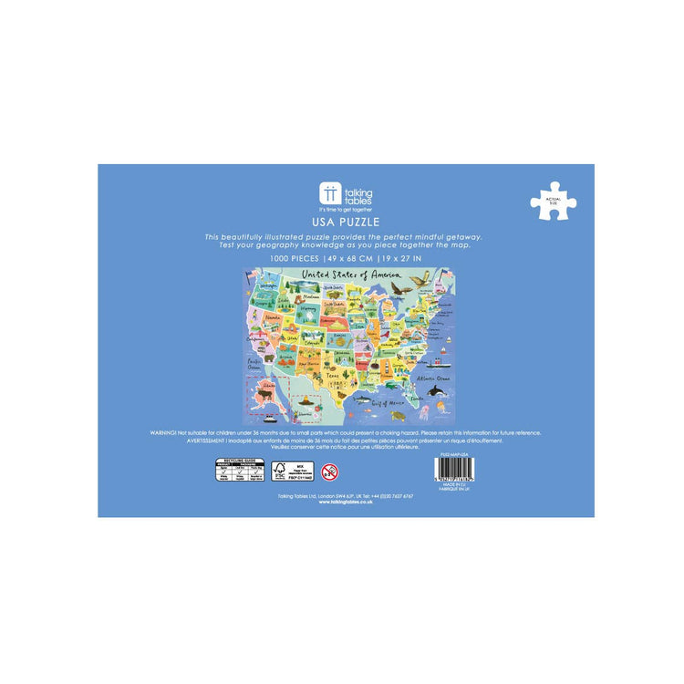1000 Piece USA Map Puzzle by Talking Tables. This colorful illustrated puzzle features landmarks from the 50 states of America. Perfect for relaxing on a rainy day or as an educational puzzle to learn all 50 States. This puzzle also comes with a matching poster of the finished design and can be framed as wall art. A great Birthday present or Christmas gift for any Geography lover or puzzle fan. This puzzle is 1000 pieces. Recommended for age 10+. Constructed Puzzle Size - 19" x 27"