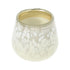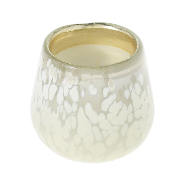 This silver mercury glass votive features milky white spotted detail and "Wander" scent. This candle is an upscale way to add modern ambiance to your home or event.