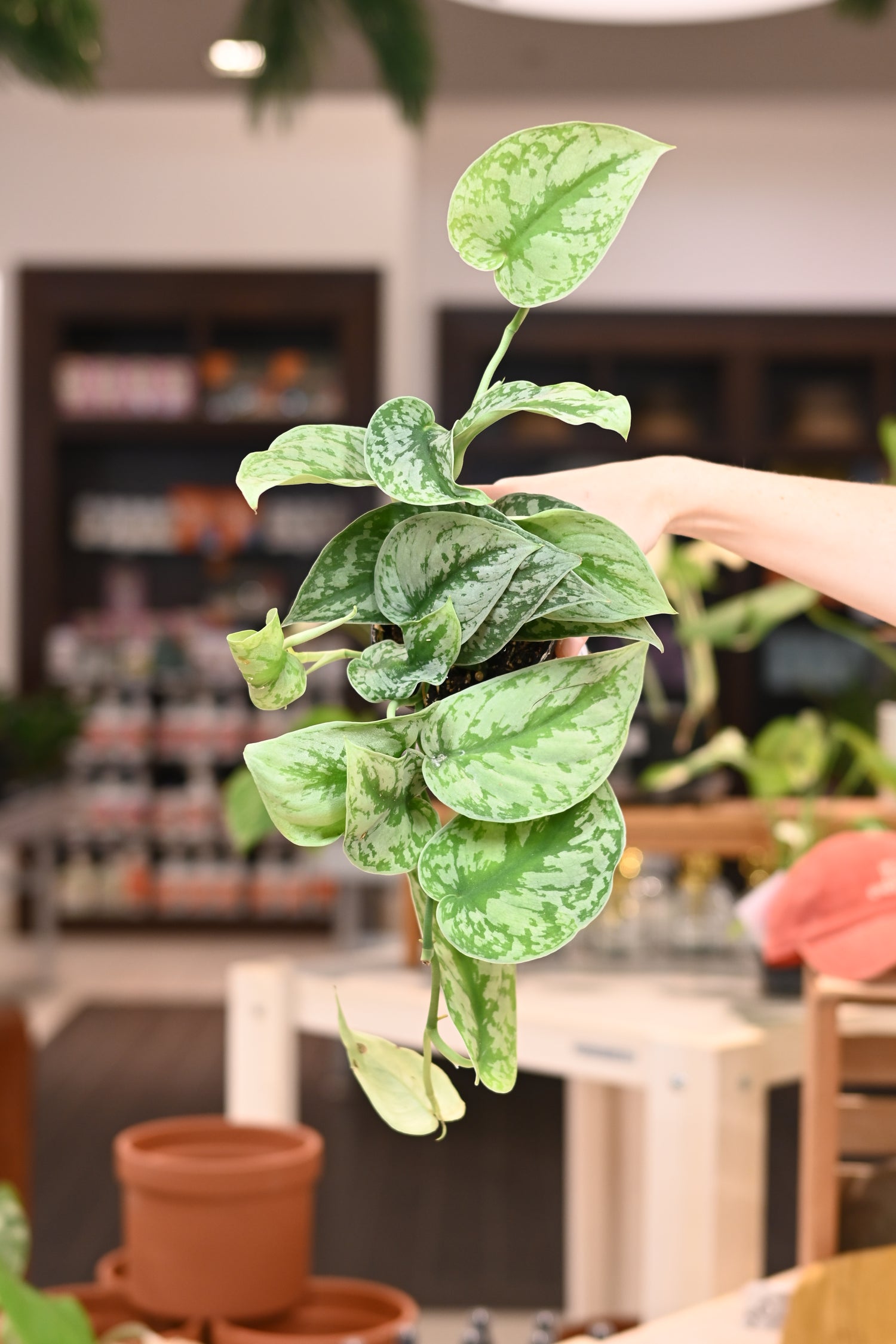 Pothos, Epipremnum, Scindapsus plants are some of the easiest out there. They can tolerate low light, and are drought tolerant. Water when the soil is dry about 50%. Keep them in a well-aerated soil.